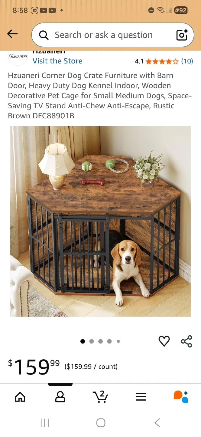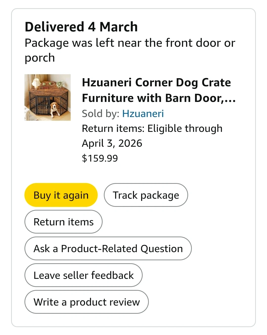 I purchased this dog crate from Amazon on March 2nd. It was delivered on March 4th. It won't work for my space.