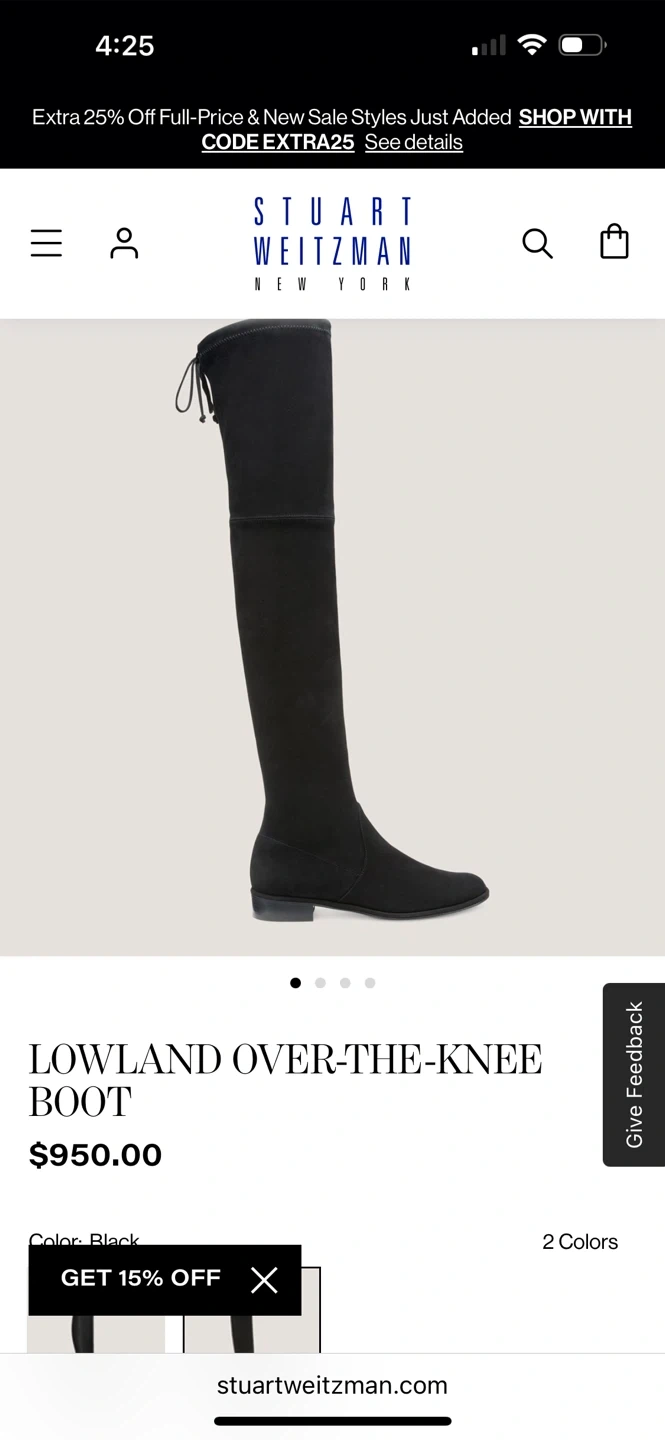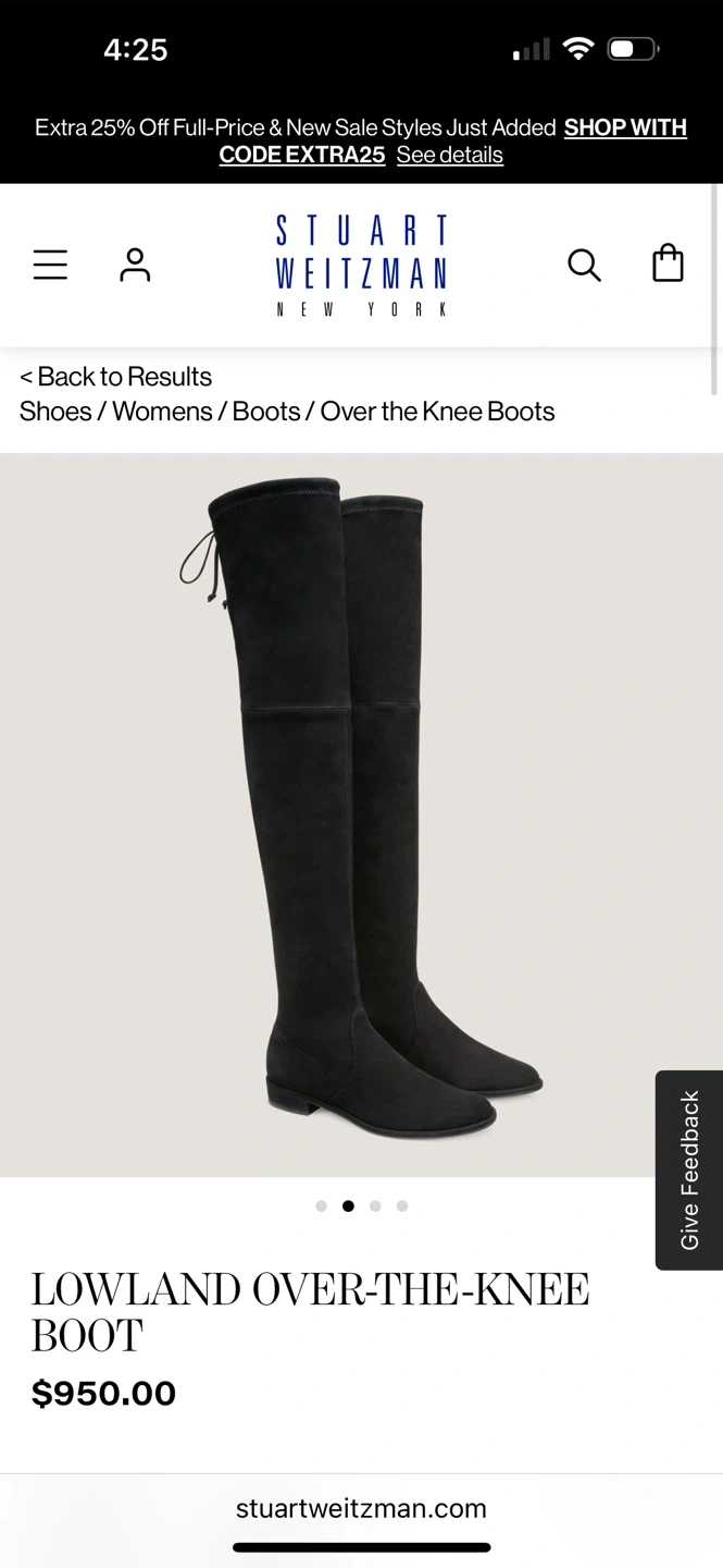 These are black Stuart Weitzman Lowland over-the-knee boots. They're made with a suede-like material and have a tie detail at the back. This style is a classic for a reason!