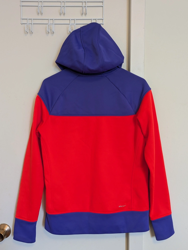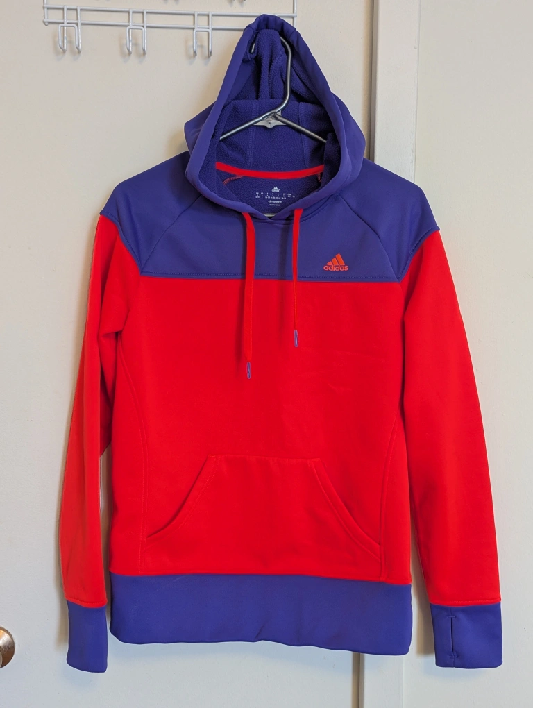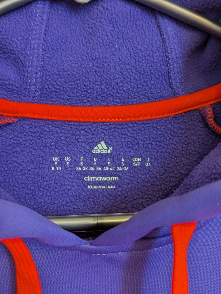 Women's Adidas hoodie. Size small. Bright orange and purple colour block design. Climawarm technology. Features a fleece interior lining at cuffs. Thumbholes at cuffs. Good condition.