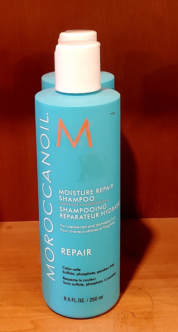 A bottle of Moroccanoil Moisture Repair Shampoo. 8.5 fl. oz. / 250 ml. New never used.