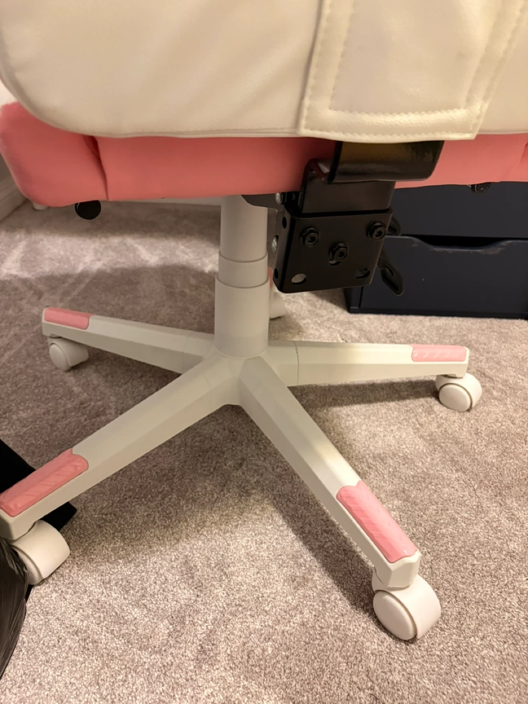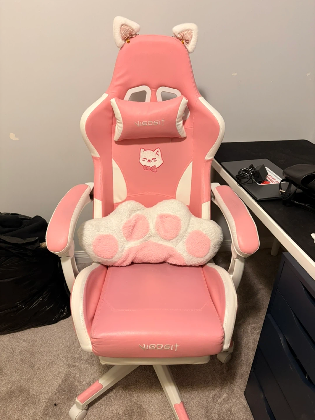 Cute pink gaming chair with white accents and fluffy cat ears on top. Includes a matching lumbar pillow shaped like a cat paw. This chair's design makes it a fun addition to any gaming setup!
