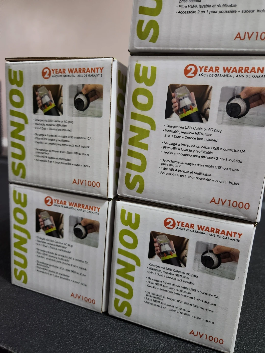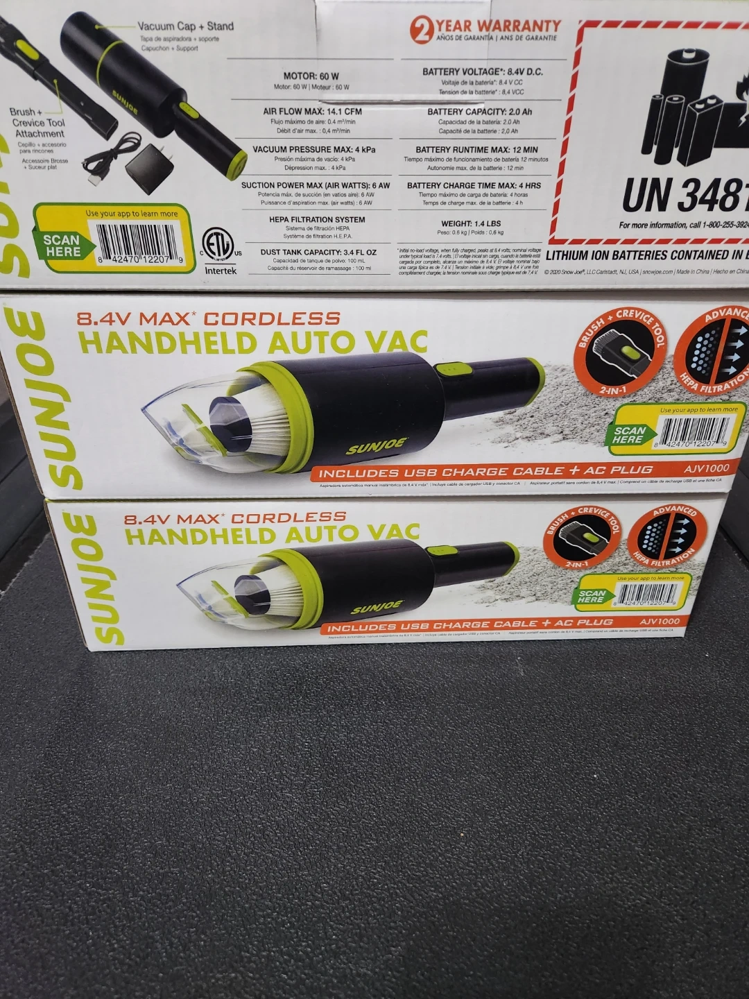 I'm selling a brand new Sun Joe 8.4V MAX Cordless Handheld Auto Vac, model AJV1000! This handy little vacuum is perfect for quick clean-ups in your car or around the house. It features a washable HEPA filter and comes with a USB charge cable and AC plug, so it's always ready to go. It also includes a brush and crevice tool attachment for those hard-to-reach spots. Includes the box!
