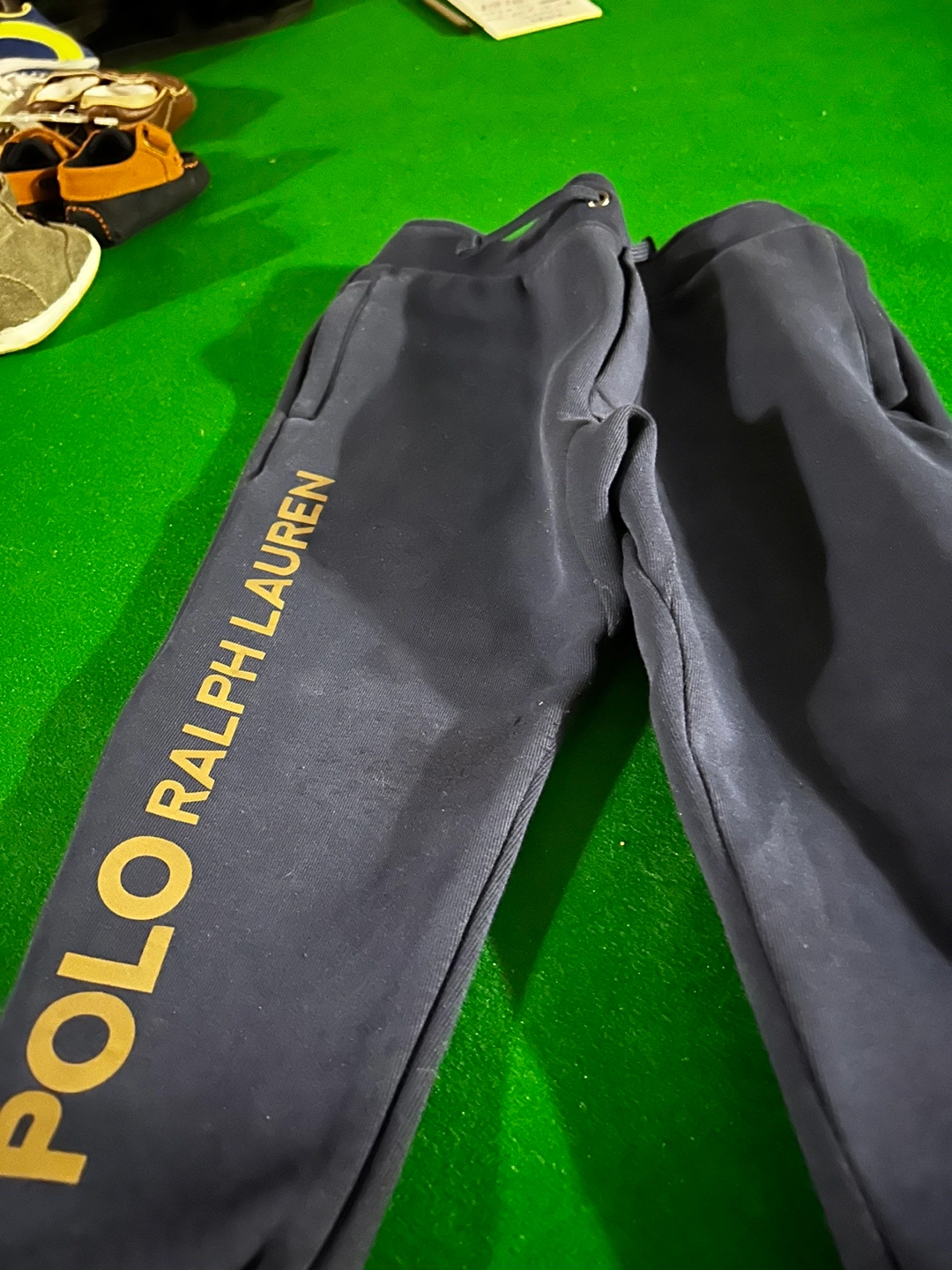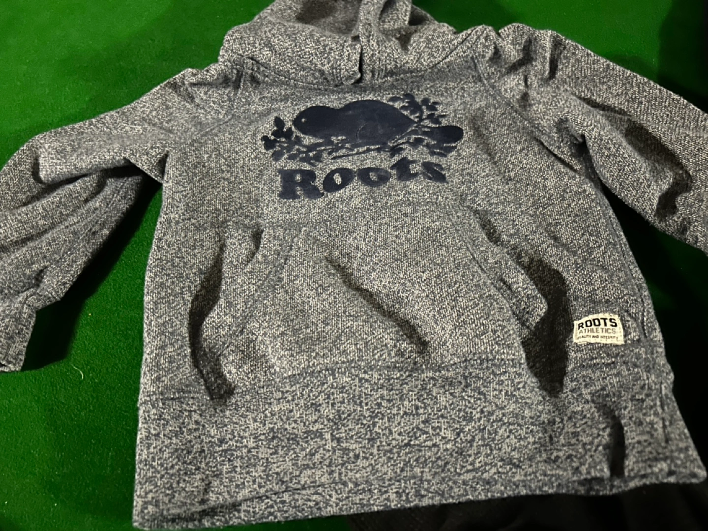 Kids' clothing. including a Roots hoodie and Polo Ralph Lauren sweatpants. Grey Roots hoodie with blue beaver logo, grey and white Roots sweatpants with red and white cuffs, and navy blue Polo Ralph Lauren sweatpants with gold writing.