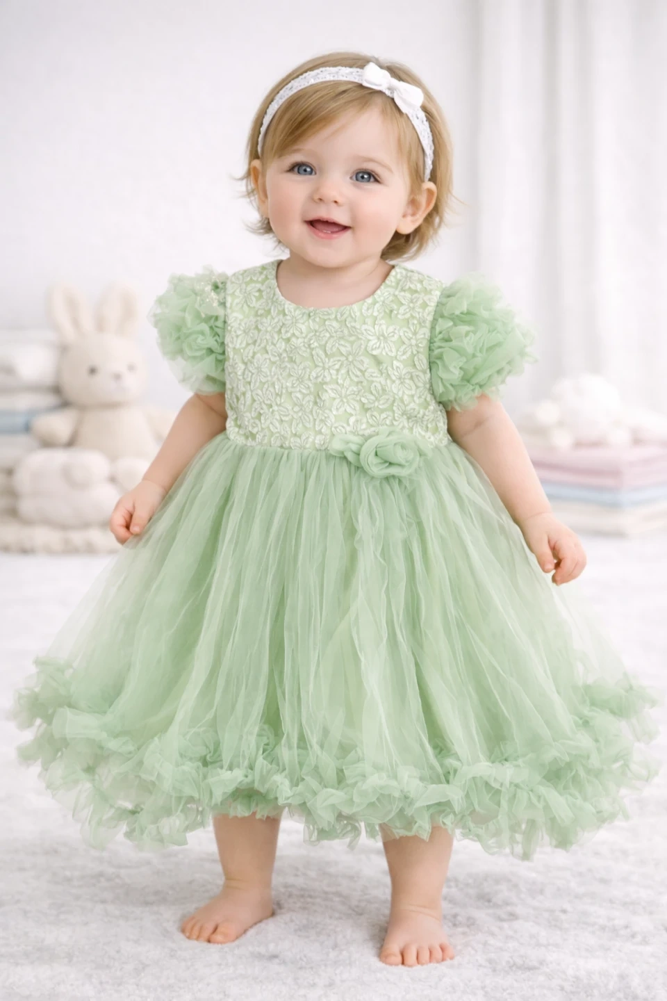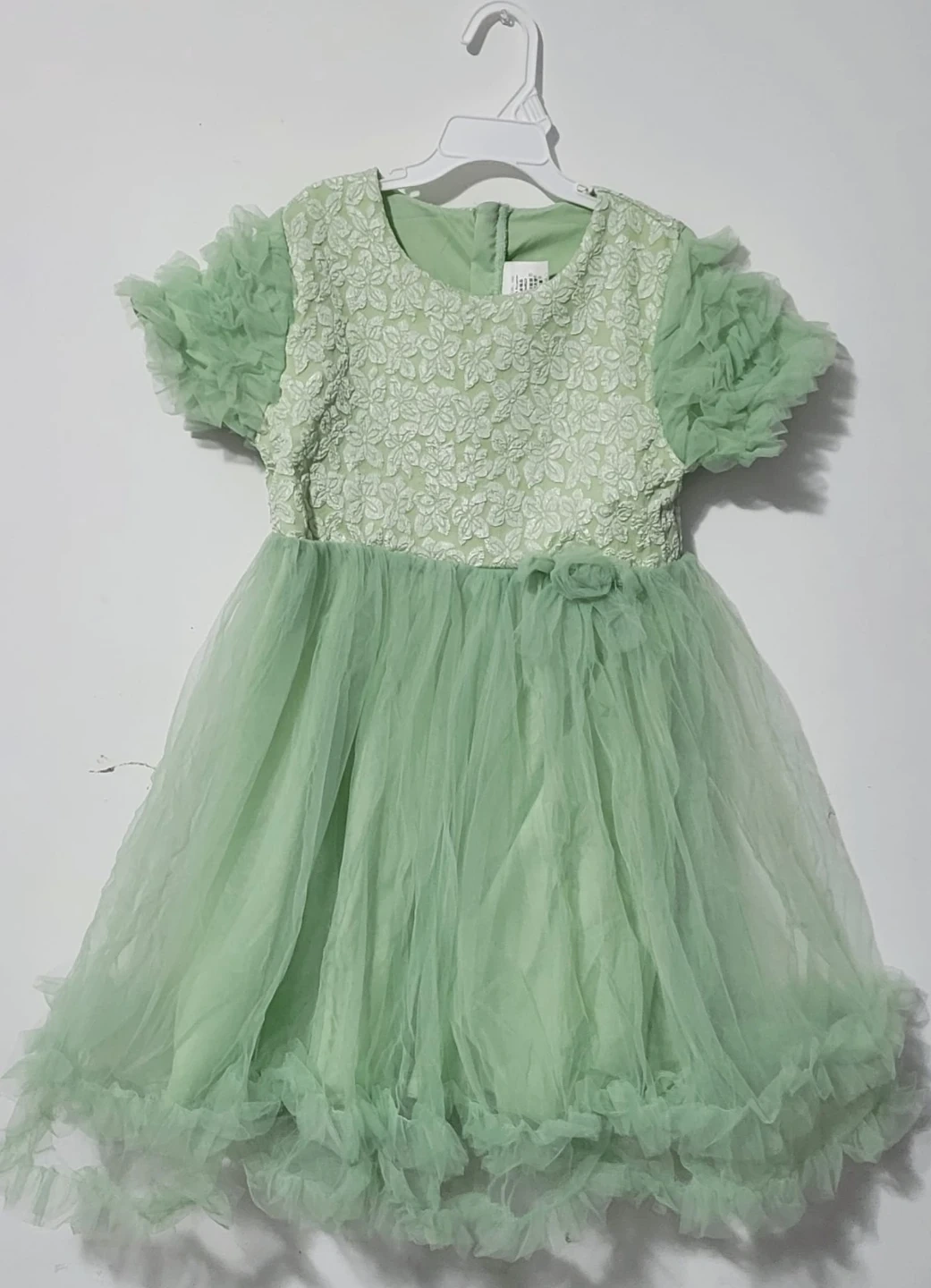This sweet green dress features a delicate lace bodice and a fluffy tulle skirt with ruffled trim. It's perfect for special occasions or parties. The dress has short, puffy sleeves and a floral accent at the waist.