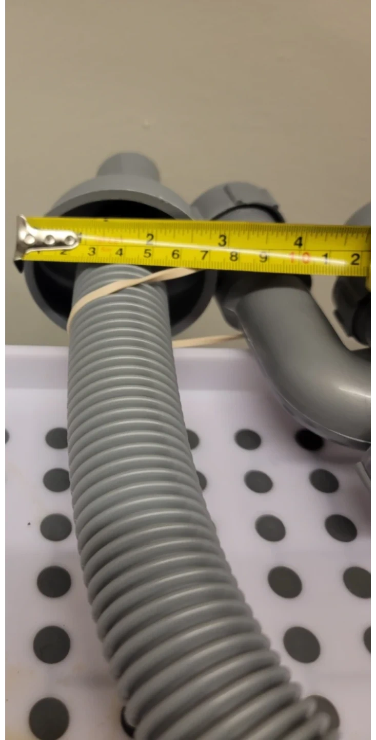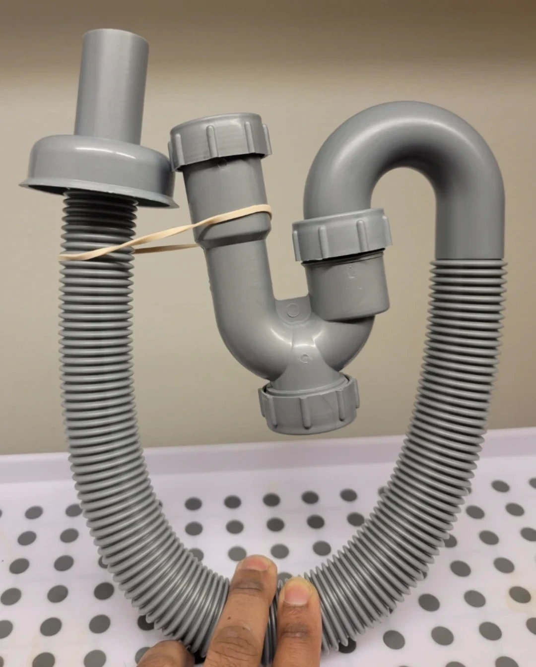 Grey flexible drain pipe with a built-in P-trap. It's made of durable plastic and has threaded connections. This pipe is useful for installations to prevent odours from entering the space.