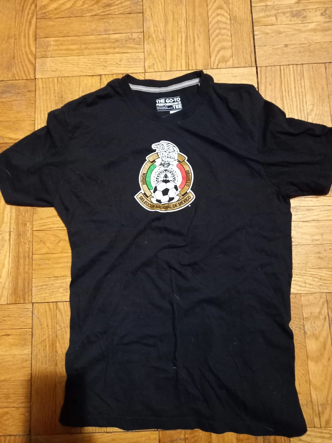 This is an Adidas Mexico National Team t-shirt in size M/M. It's made from 60% polyester and 40% cotton. The shirt features the Mexico crest on the front.