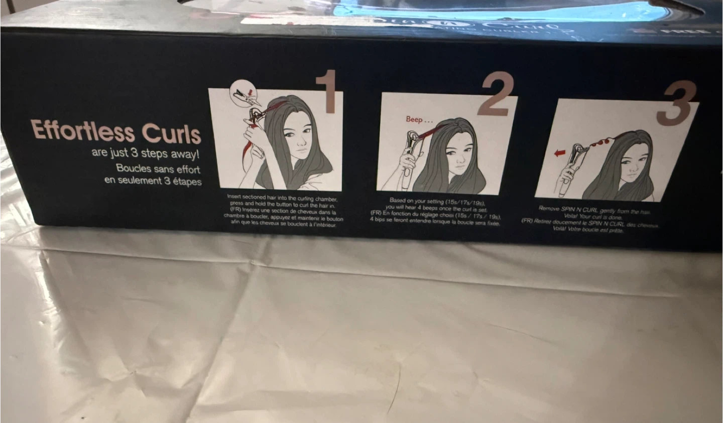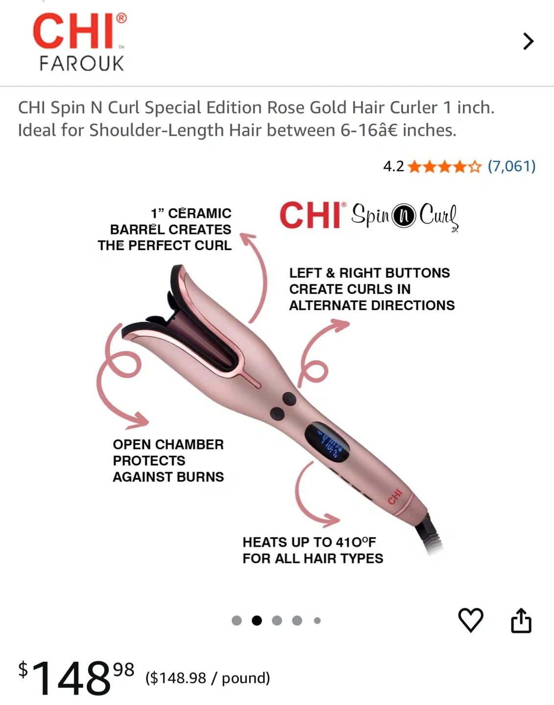 This is the CHI Spin N Curl Special Edition Rose Gold Hair Curler with a 1-inch ceramic barrel. It heats up to 410°F for all hair types and offers left and right button controls for curl direction. Comes with a free cleaning tool.