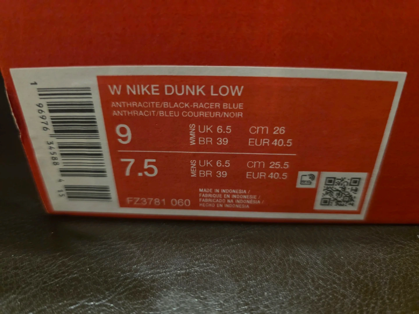 These are a pair of Nike Dunk Low sneakers in women's size 9. The color is Anthracite/Black Cyber reflective racer blue. Comes with the original box. Cash only