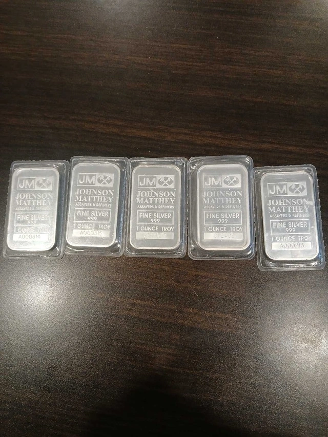 I'm offering five 1 ounce Johnson Matthey fine silver .999 bars. These bars are a great way to invest in precious metals and add to your collection. Manufacturer: Johnson Matthey, Weight: 1 troy ounce, Purity: .999 Fine Silver. If this ad is still up, yes, they're still available! Cash accepted.