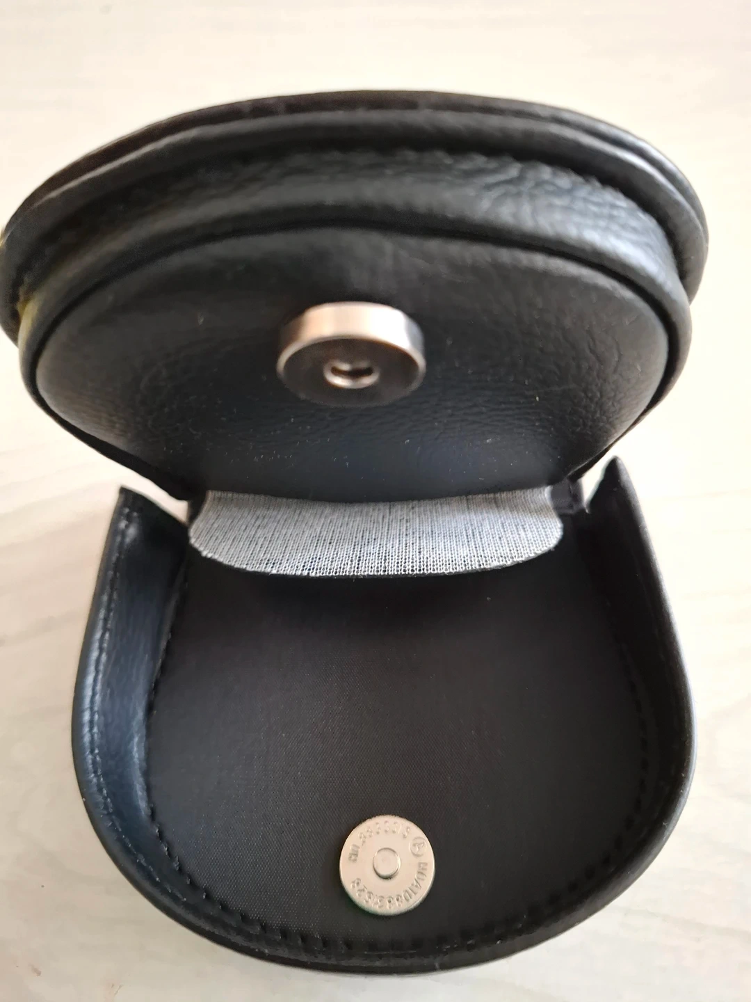 A black coin pouch made of leather. It has a snap closure for security. This pouch is great for keeping your loose change organized.