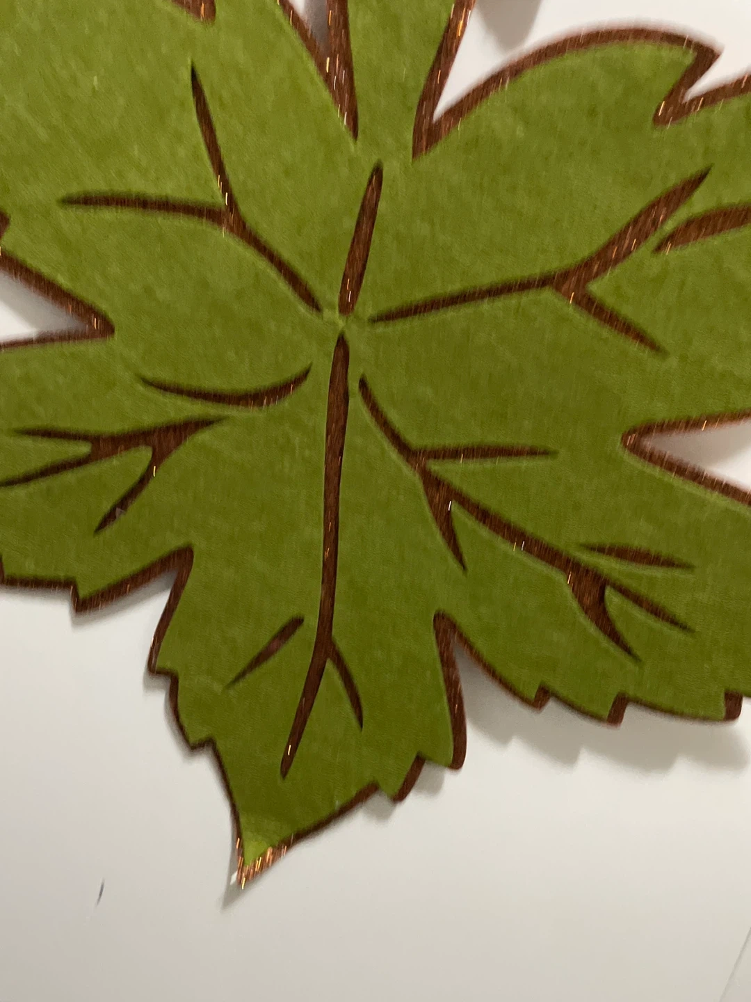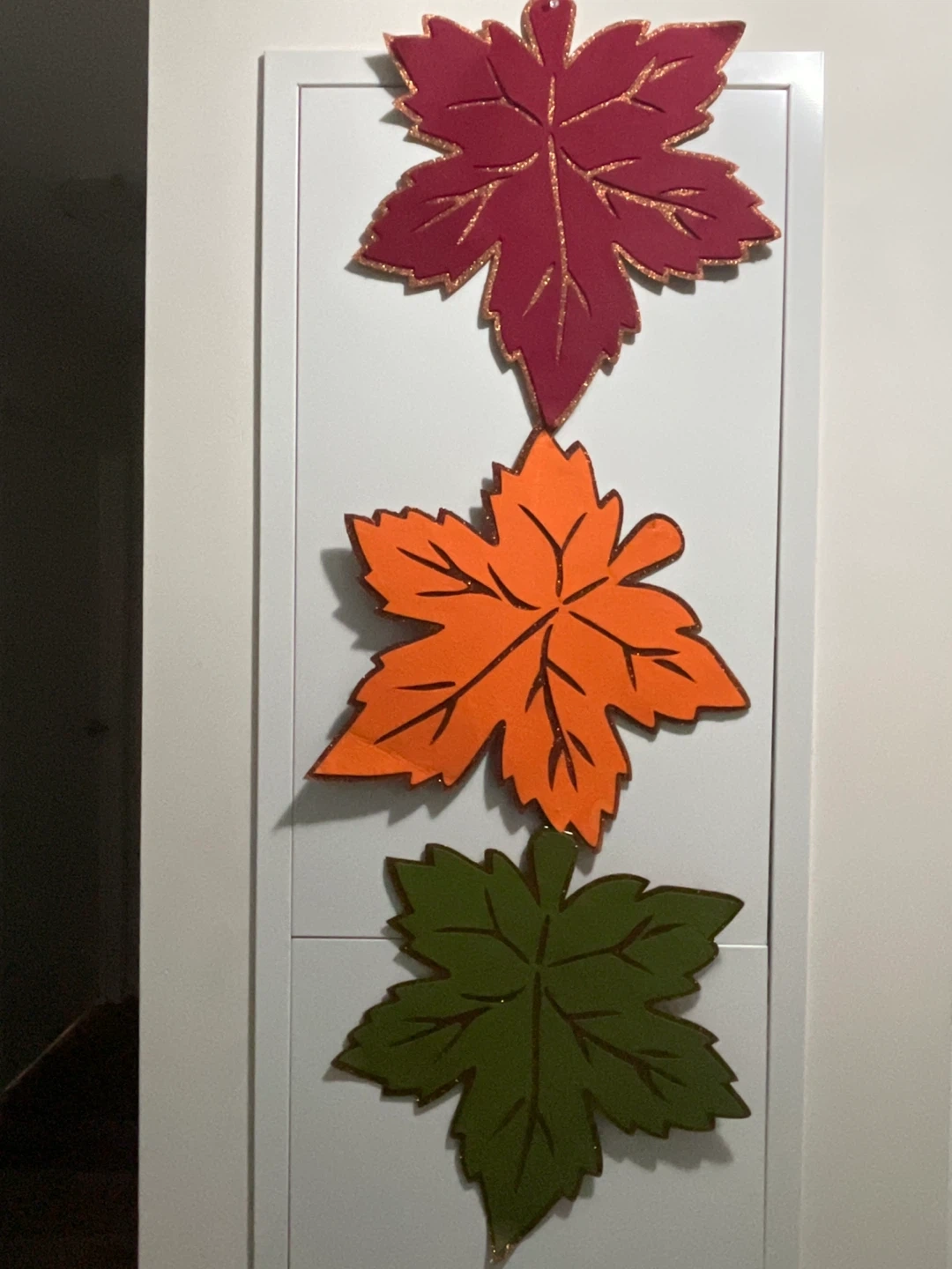 Autumn themed felt leaf garland. Features three maple leaves in red, orange, and green. Each leaf has glitter-trimmed edges. Great for seasonal decor!