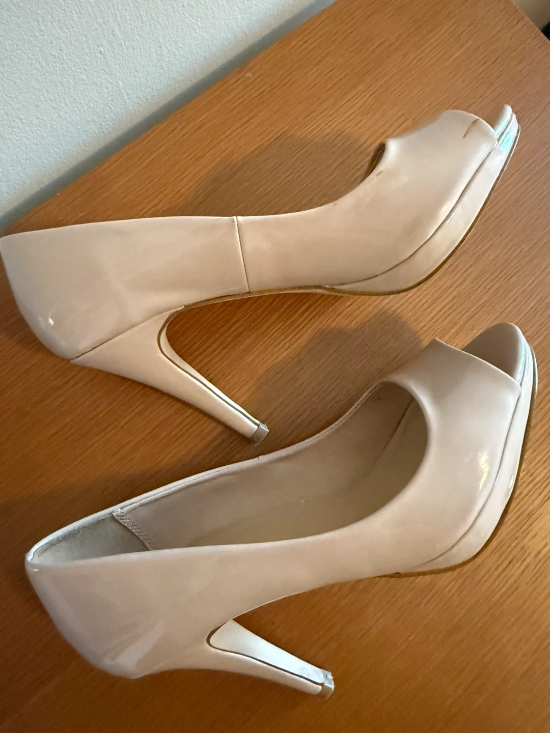 These Aldo heels are a classic peep toe style in a beige patent leather finish. They're perfect for dressing up any outfit! There are some signs of wear, as shown in the pictures.