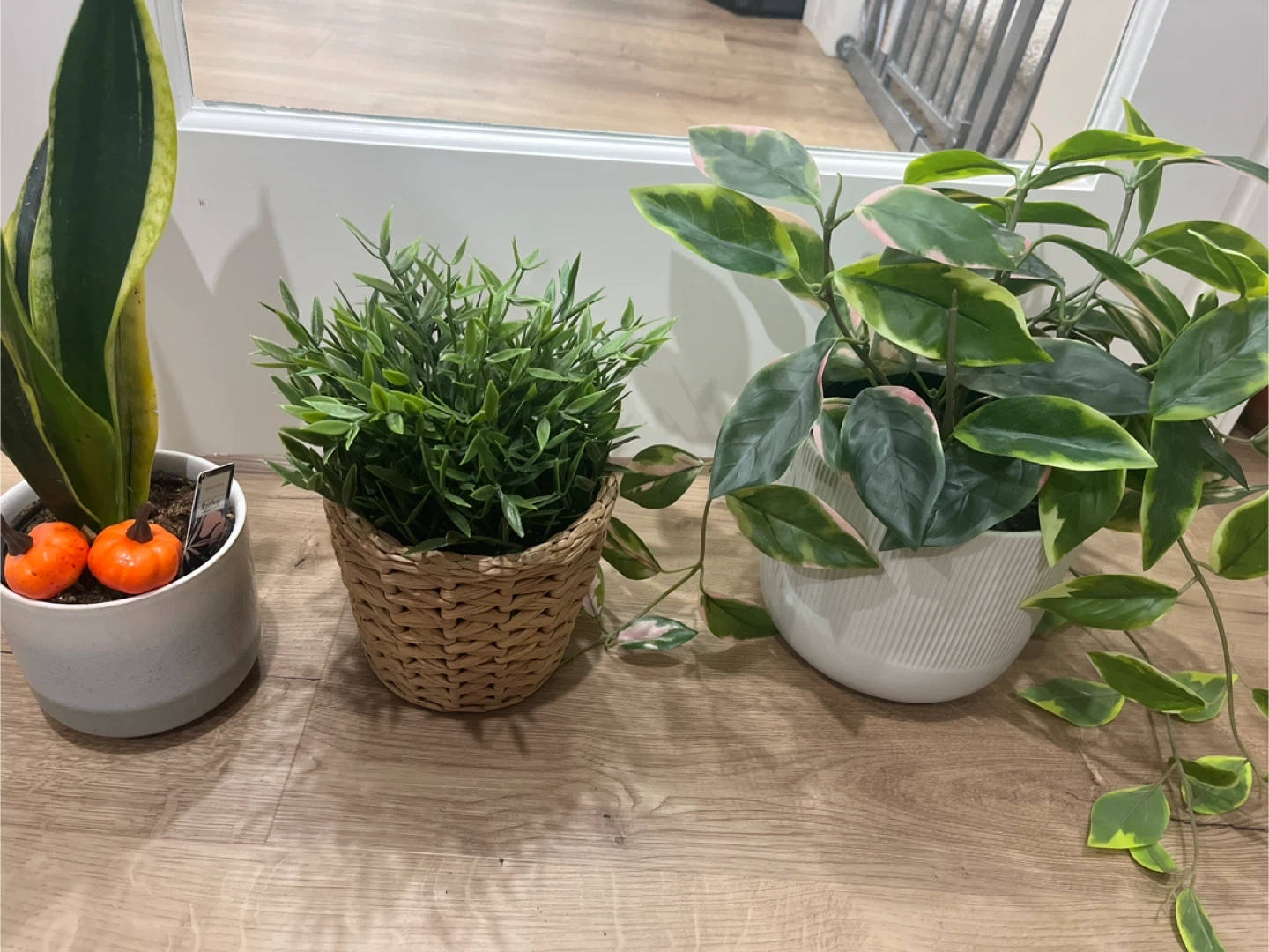 A set of three artificial potted plants. Includes a snake plant with decorative pumpkins, a grass-like plant in a woven pot, and a variegated Hoya plant in a ribbed white pot. These plants add a touch of green without the need for watering.