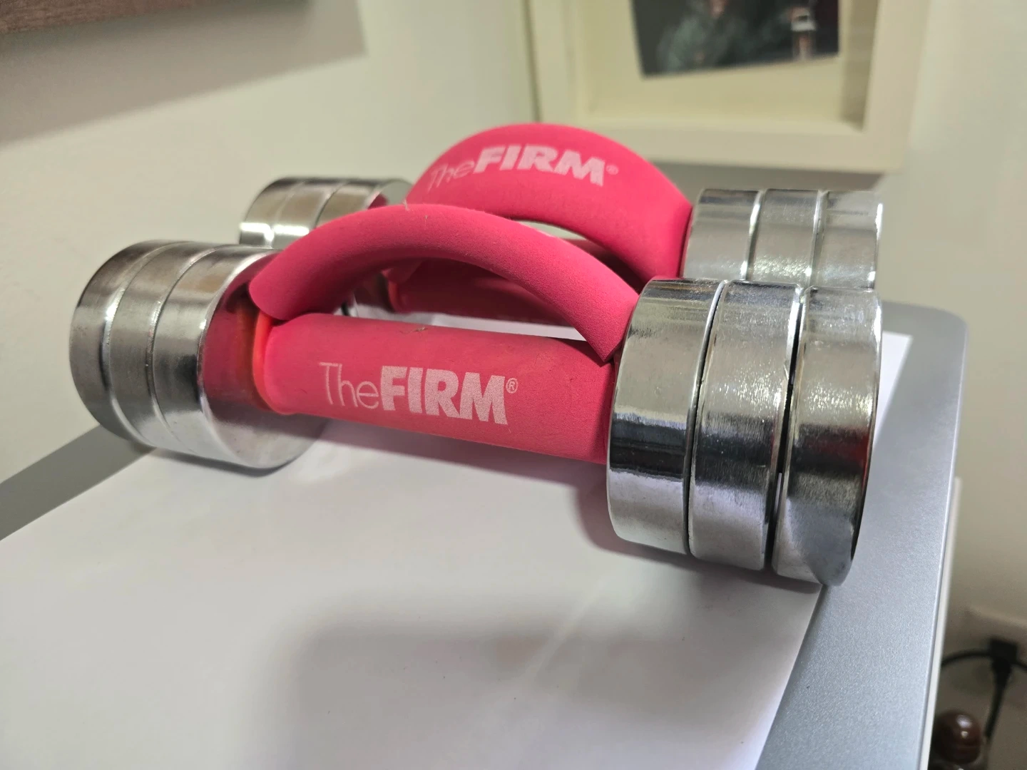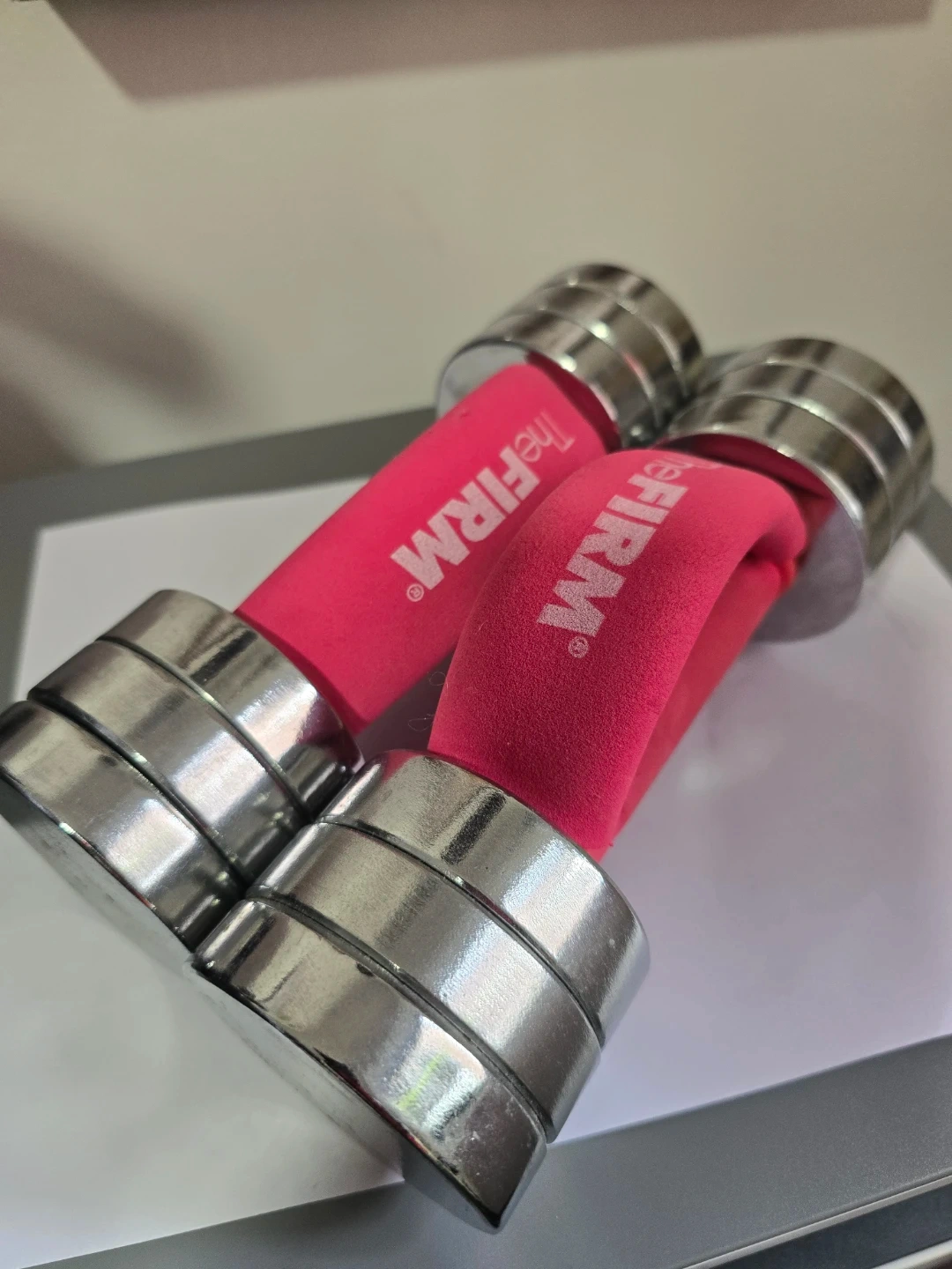 Pink handled dumbbells by The FIRM. Features chrome-plated weights and comfortable foam grips. These are sold as a pair.4.2kgx2 and you can add weighs or reduce.