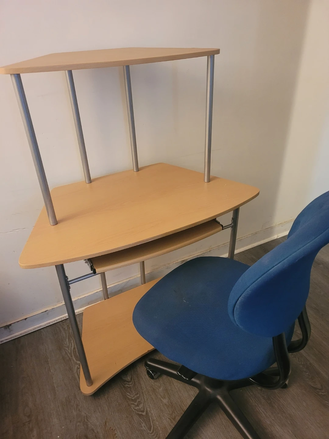 Selling a corner desk with a shelf! It's in good condition and perfect for a small space. The desk is a light wood colour with silver metal legs. It also has a pull-out keyboard tray. The shelf provides extra storage space. Great for a home office or student! Chair is included.