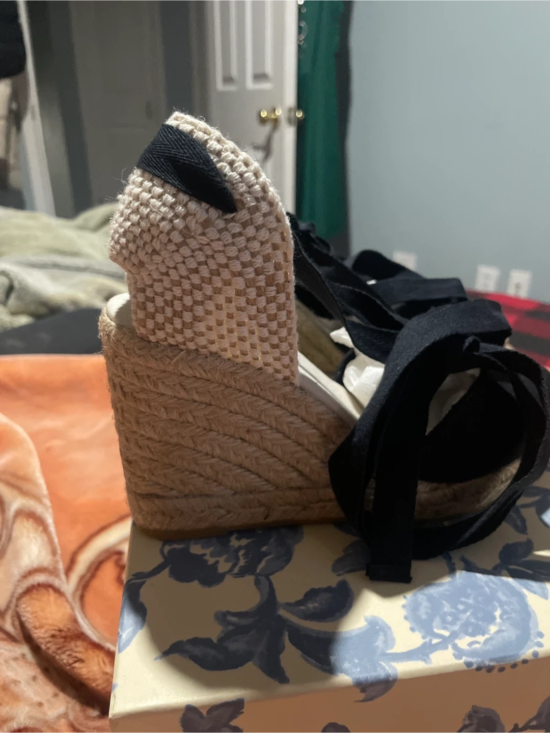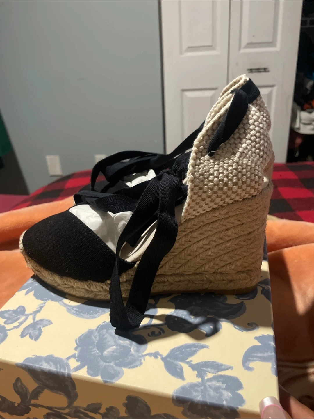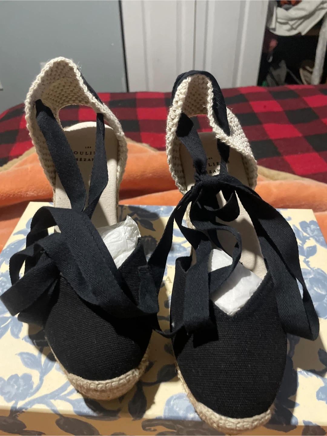Black espadrille wedges by Les Souliers Sezane. Features black canvas uppers with tie-up ankle straps. Comes with original box and the original shoe bag inside. Size is 35.
