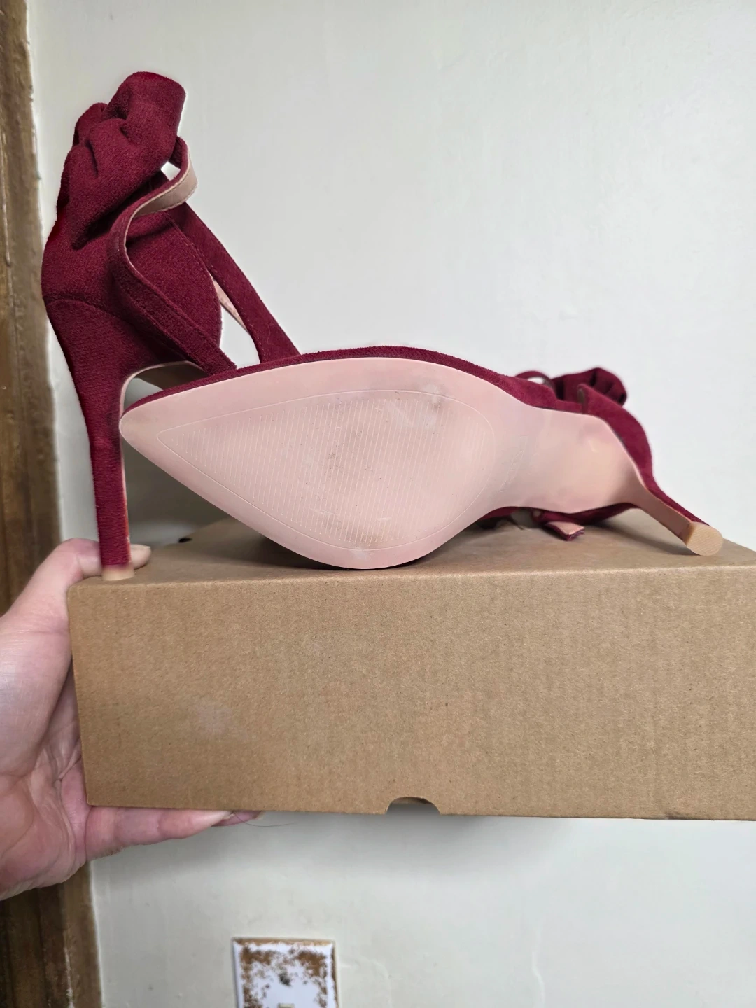 Stylish burgundy high heels with decorative bows at the back. Features delicate ankle straps for a secure fit. The pointed toe design offers a sophisticated look. Great for dressing up any outfit!