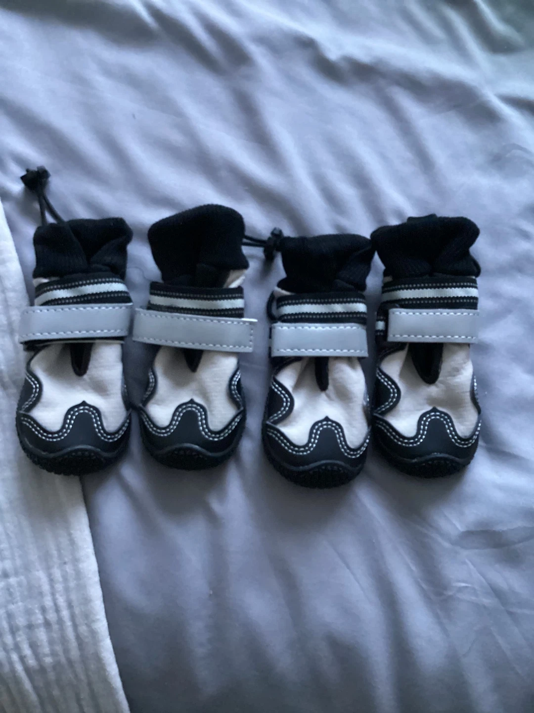 These are SlowTon dog boots for small breeds. They're waterproof and designed for walking in rain, snow, or cold weather. The boots are size 2 made of rubber with grey and white stitching and use a hook and loop closure.
