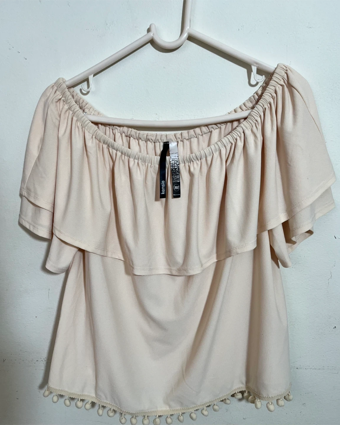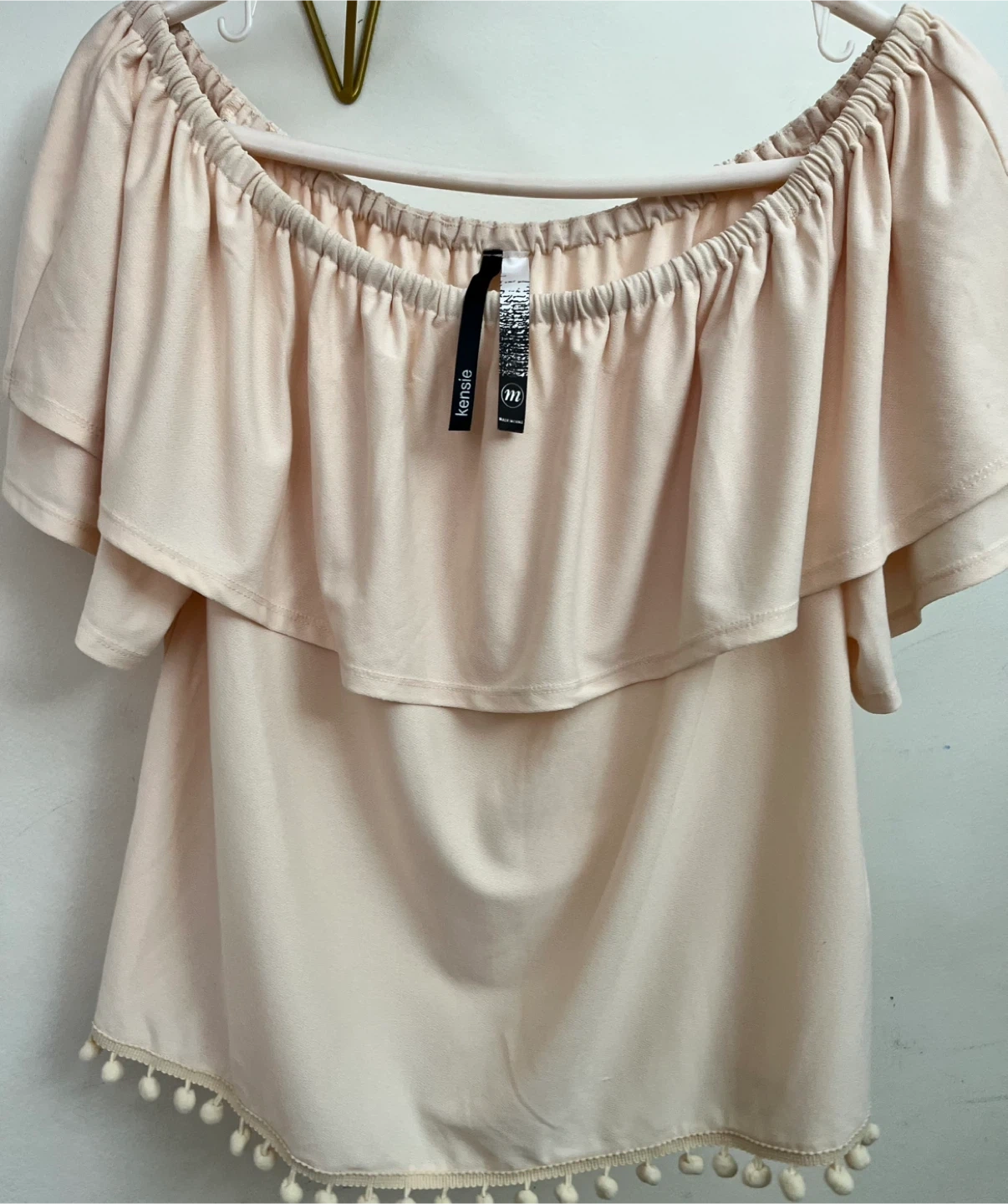 This Kensie off-the-shoulder blouse is a lovely peach color. It features a tiered ruffled design and a playful pom-pom trim along the hem. Made from a soft fabric, it's perfect for warm weather occasions!