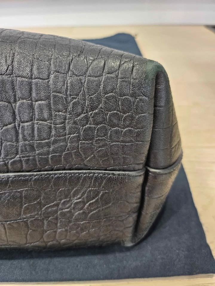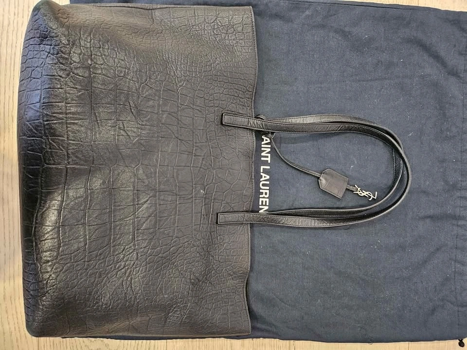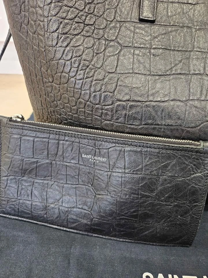 YSL Saint-Laurent Shopping Tote in black leather with an embossed croc pattern. Features a Cassandre charm and a detachable interior zipped purse. Silver hardware with a magnetic snap tab closure. Made of calfskin leather. Dimensions: 14.5 x 11 x 5.1 inches. Handle drop: 9.2 inches. In great condition with very little use. Pick up in Markham.