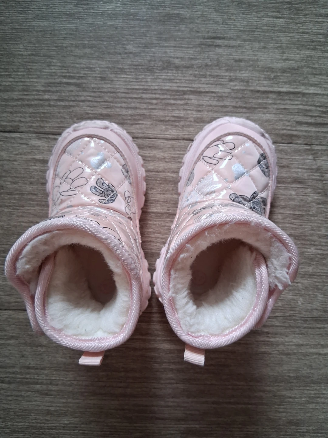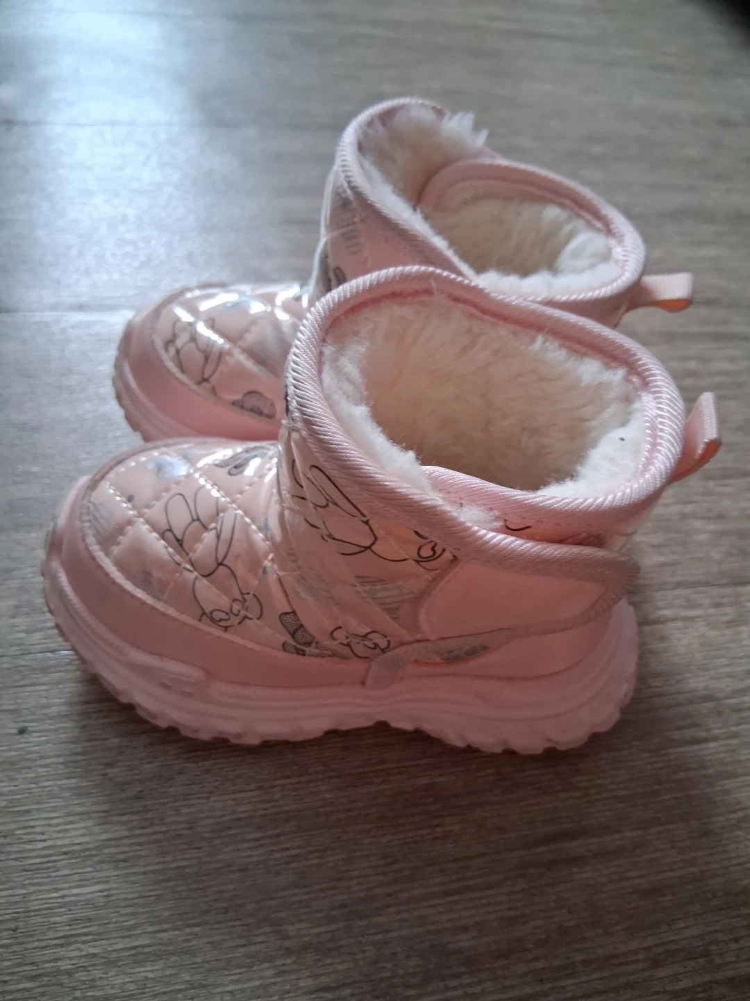 Cozy pink winter boots for little ones. They're insulated with faux fur lining to keep toes warm. The durable rubber sole offers good traction. These boots feature a sweet bunny and cloud pattern, perfect for keeping your little one's feet toasty during colder months! Size 6 for baby and toddler. Lightly used.