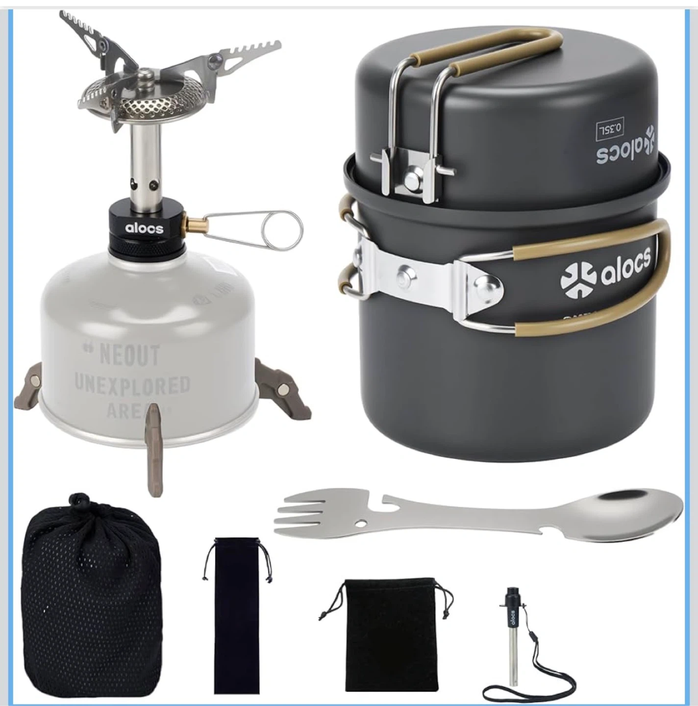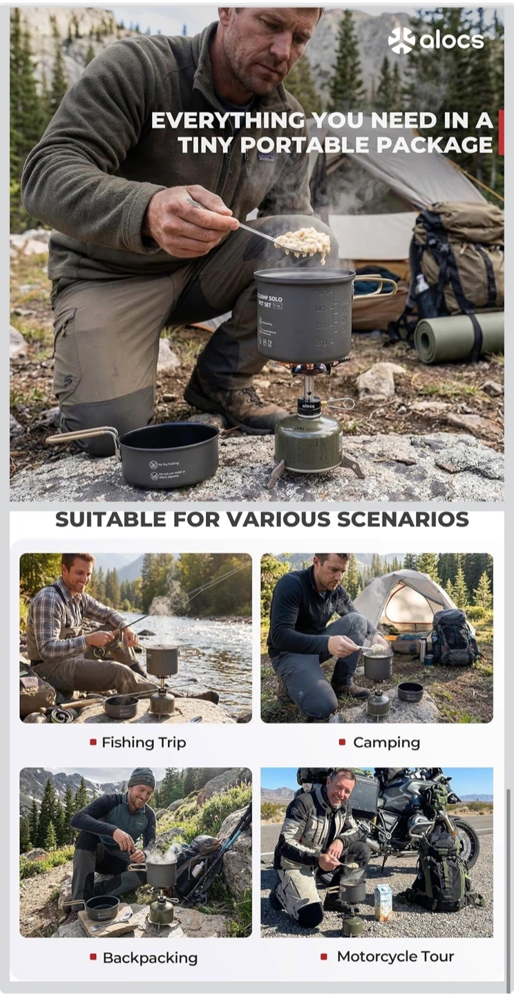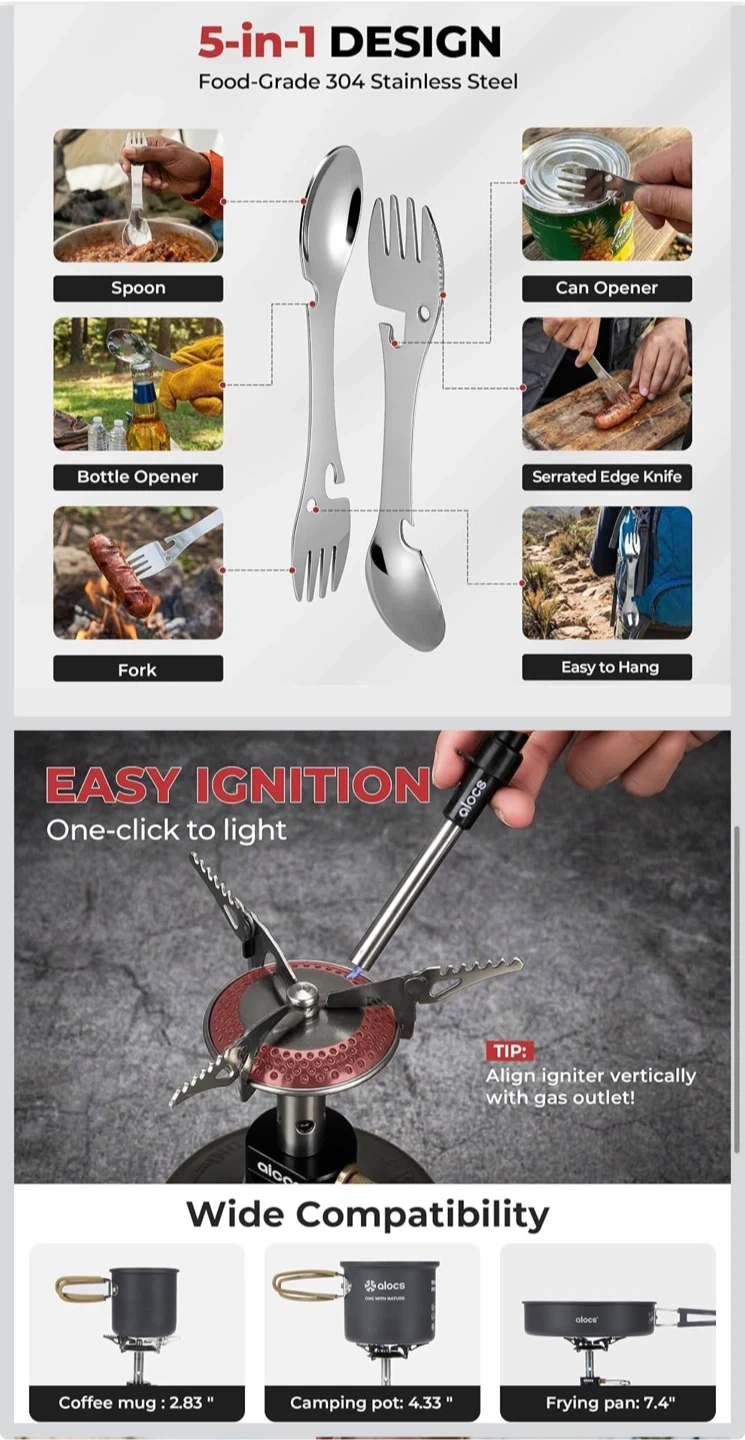 9pcs Camping Cookware Kit, Non-Stick Lightweight Camping Pots with 3200w Stove, Igniter & Gas Canister Stand, 5-in-1 Utility Spork for Hiking, Solo Camping, Backpacking, Outdoor Cooking, Picnic