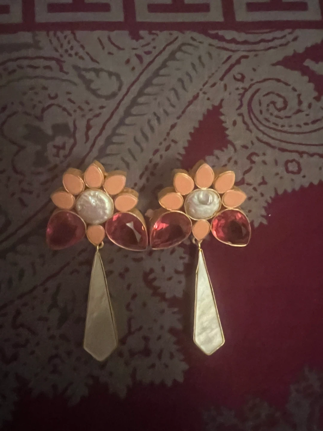These gold-tone drop earrings feature a floral design with pink teardrop stones and a white center. They have a dangling white pendant with a unique faceted shape. Perfect for adding a touch of colour to your outfit!