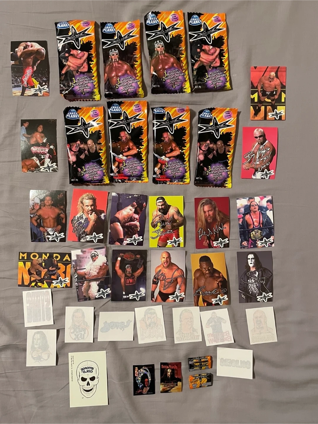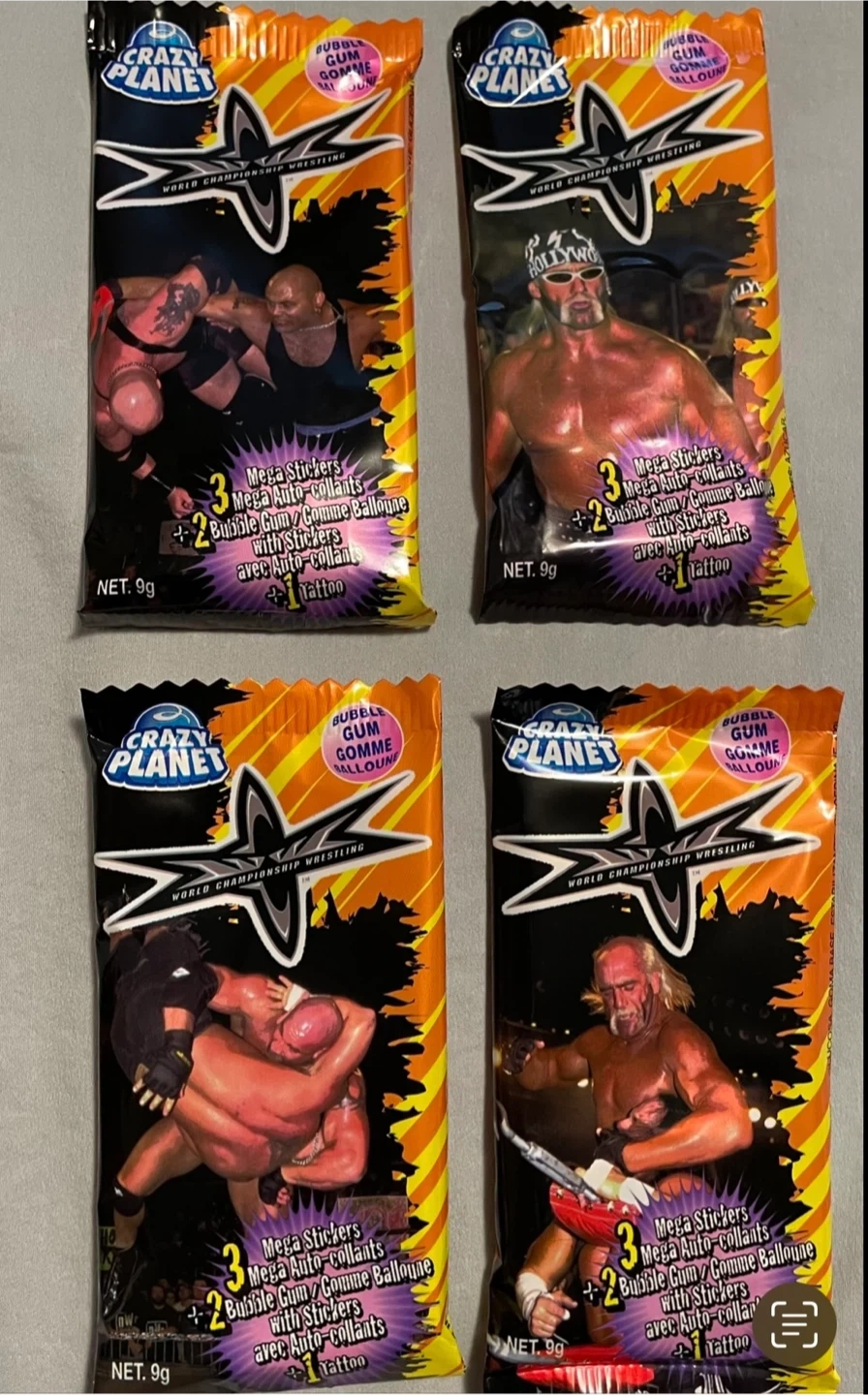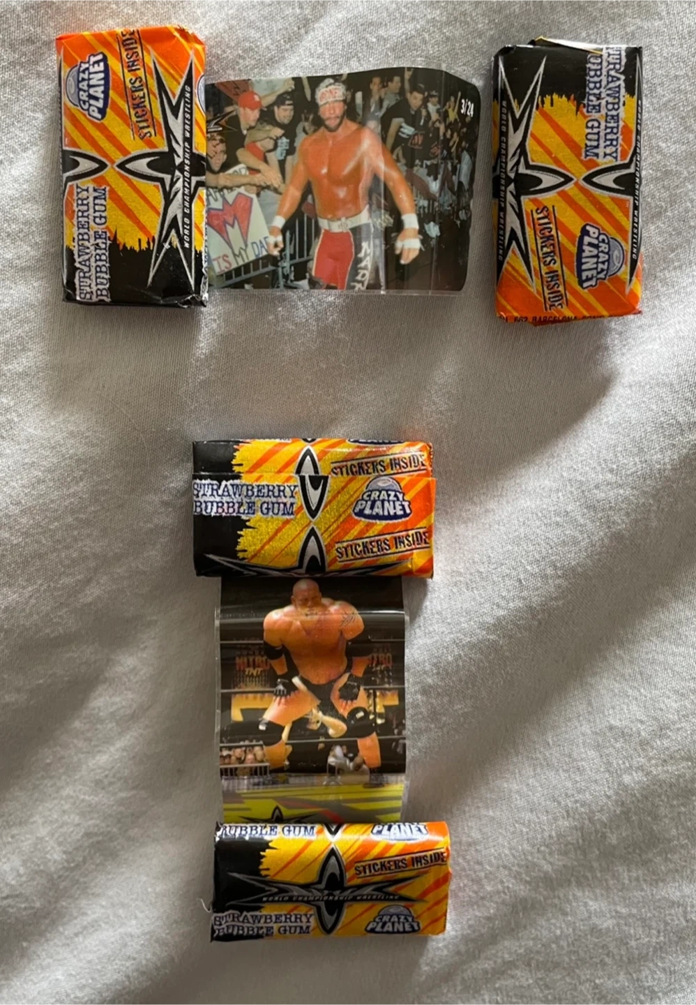I’m selling each pack for $10 or 2/$15. This lot includes multiple packs of 1999 Crazy Planet WWF wrestling bubble gum. Each pack contains 3 mega stickers, 2 bubble gums with stickers, and 1 tattoo. It's a fun collectible for wrestling fans!
