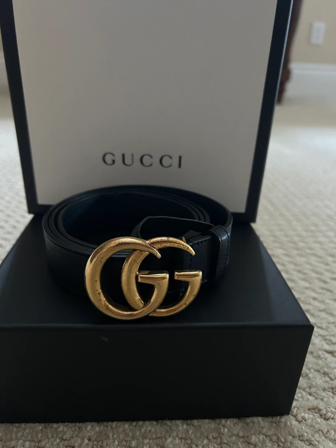 Authentic Gucci GG Marmont belt in black leather with iconic antique gold double-G buckle. Classic, timeless piece that works with jeans or dress pants.