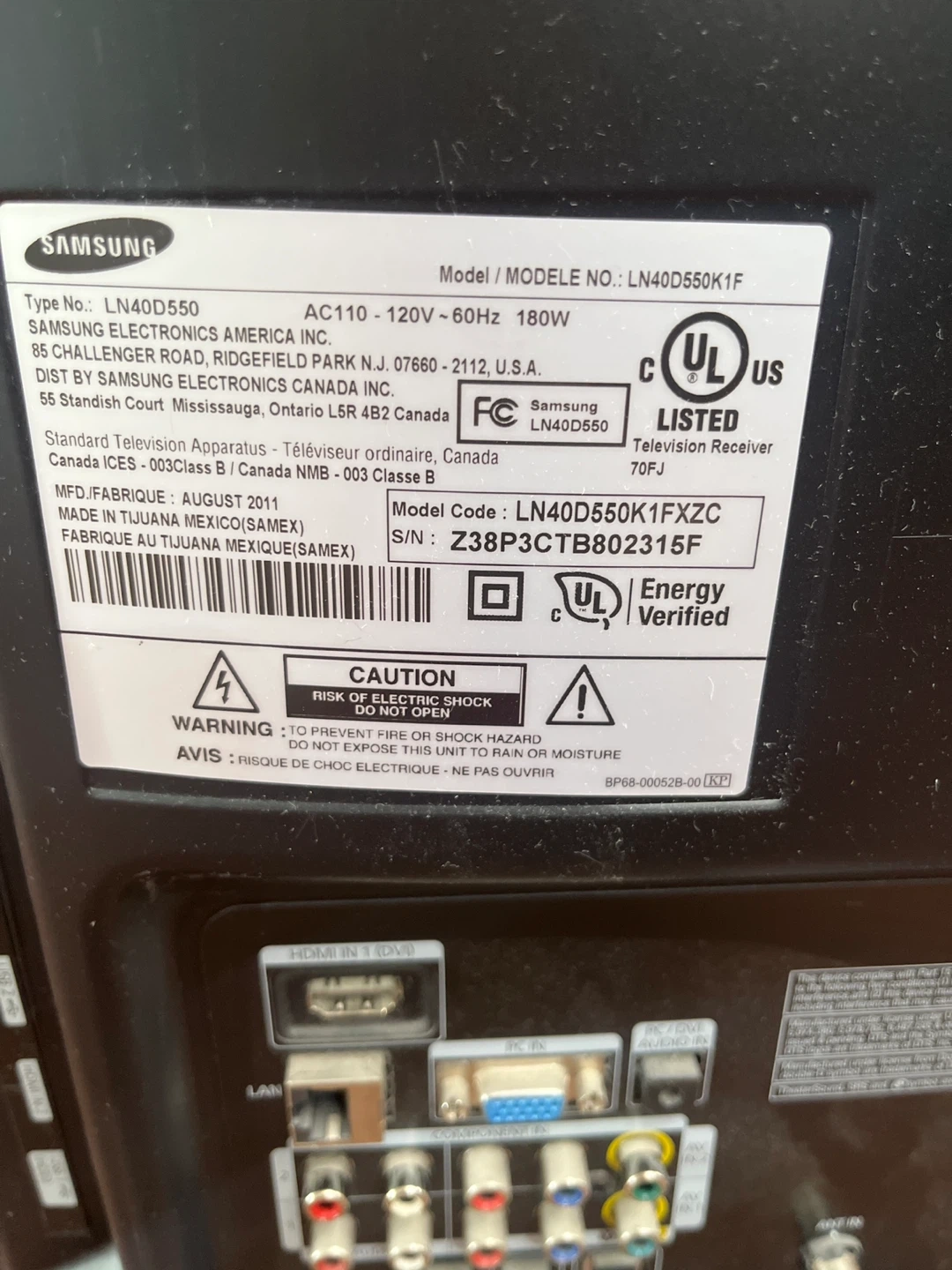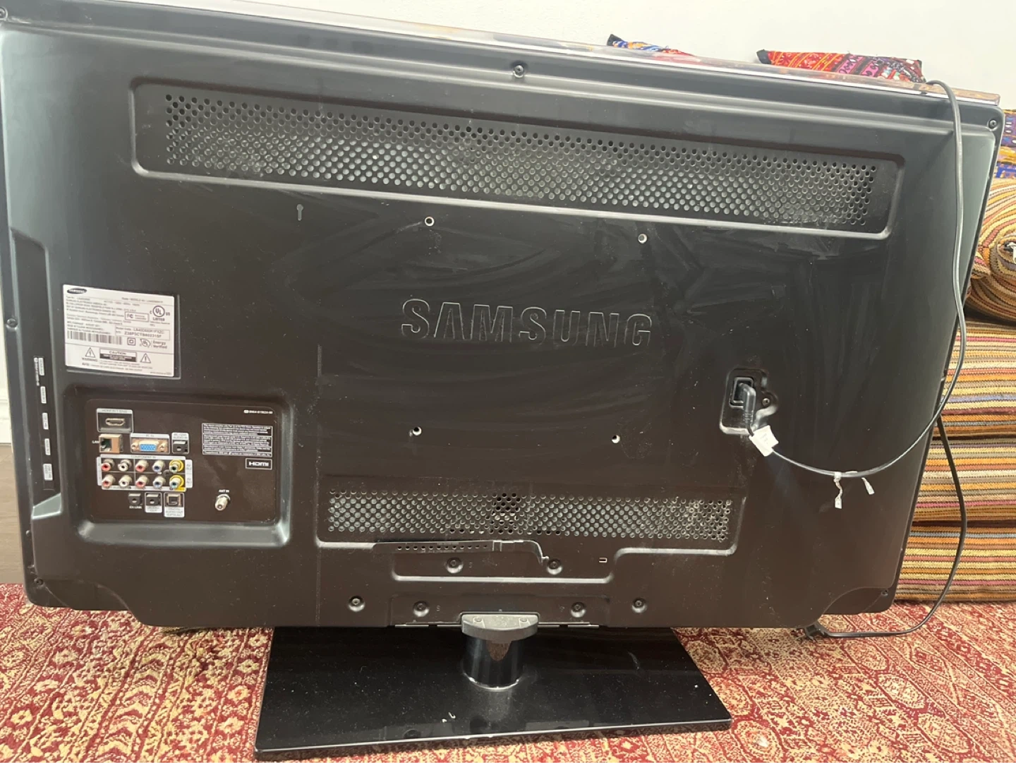 Samsung 40 inch flat screen HD television. Model LN40D550K1F. Manufactured August 2011. This TV offers multiple HDMI inputs for your devices.