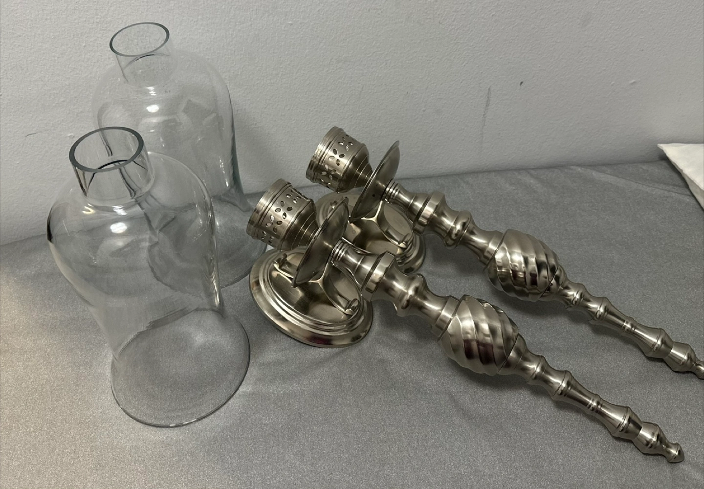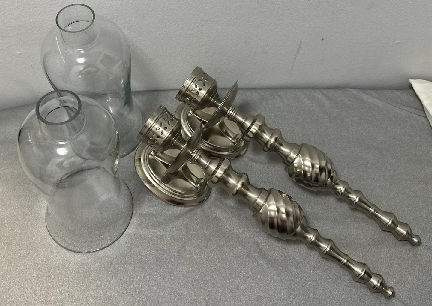 Beautiful pair of brushed nickel candle wall sconces. Features a swirling design. Includes two clear glass hurricane shades. Perfect for adding a touch of elegance to any room.