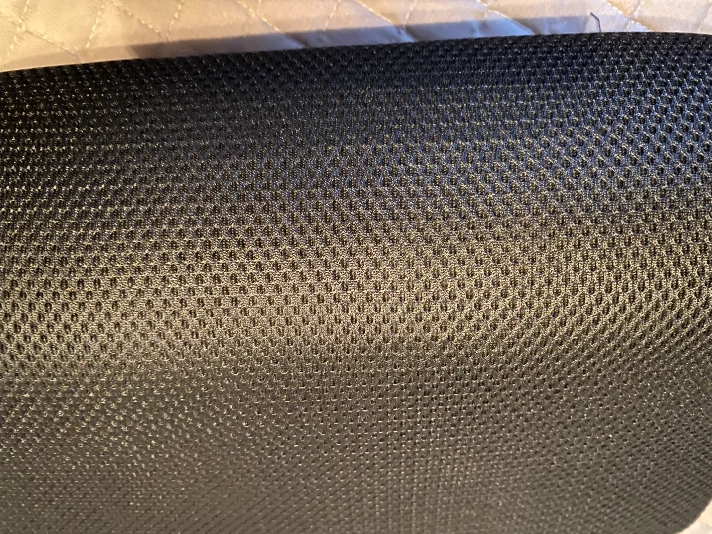 Next to new this black lumbar support pillow provides comfort and helps improve posture. It features a breathable mesh front and a strap for secure attachment to chairs. Its contoured shape offers good lower back support. This pillow is suitable for use on office chairs or car seats.