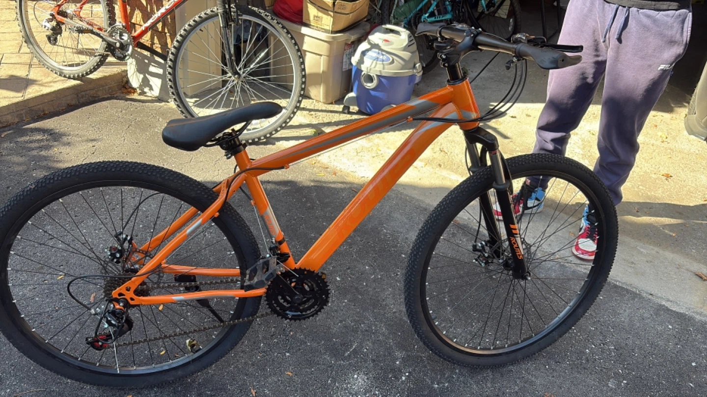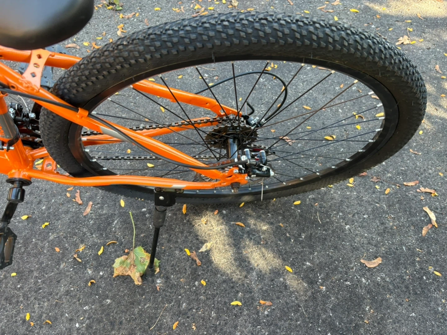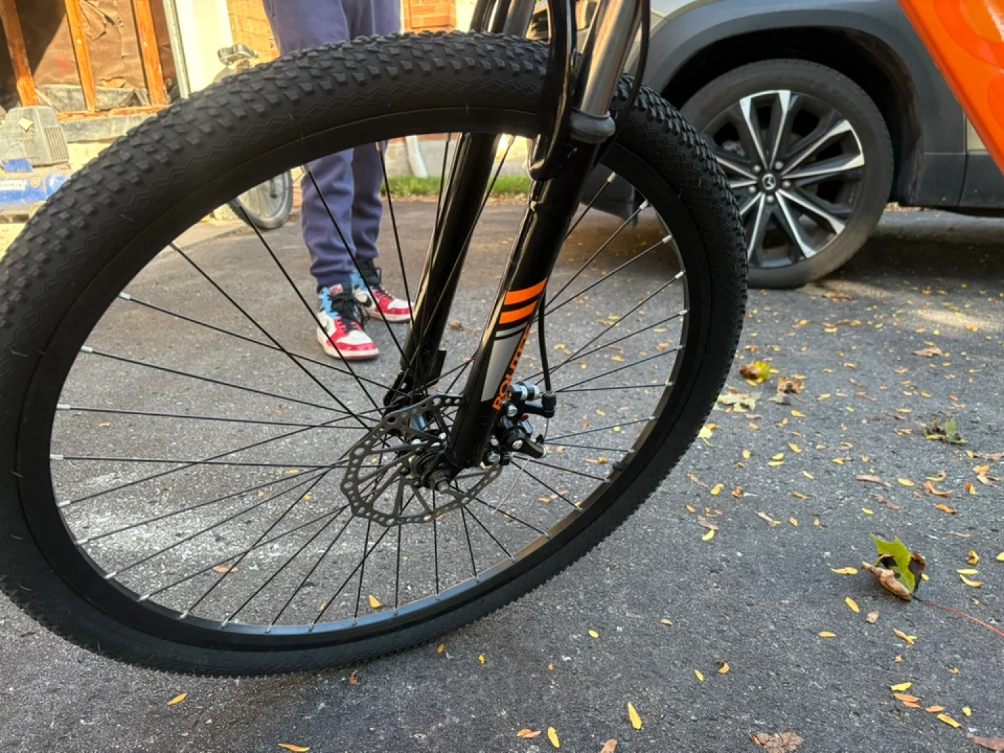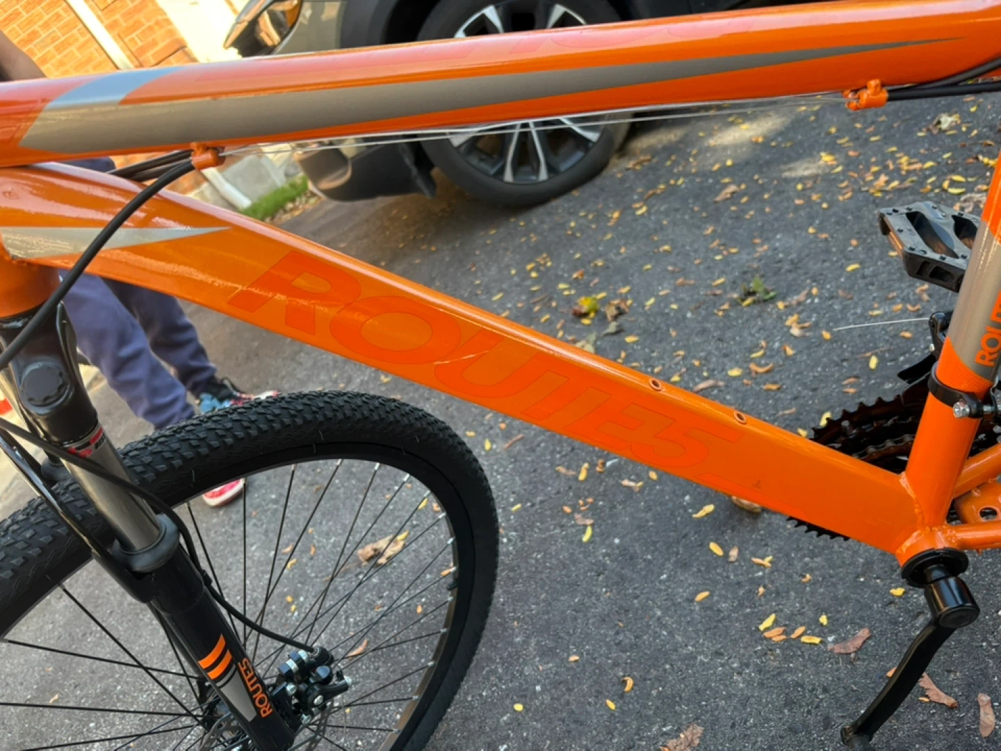 This is an orange Routes mountain bike. It features front suspension and disc brakes. This bike would be good for recreational trail riding.