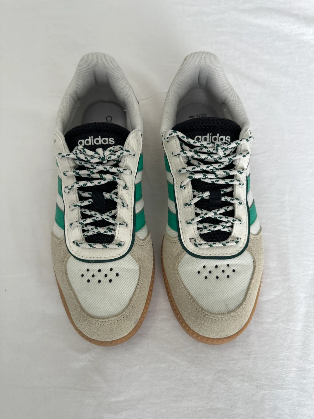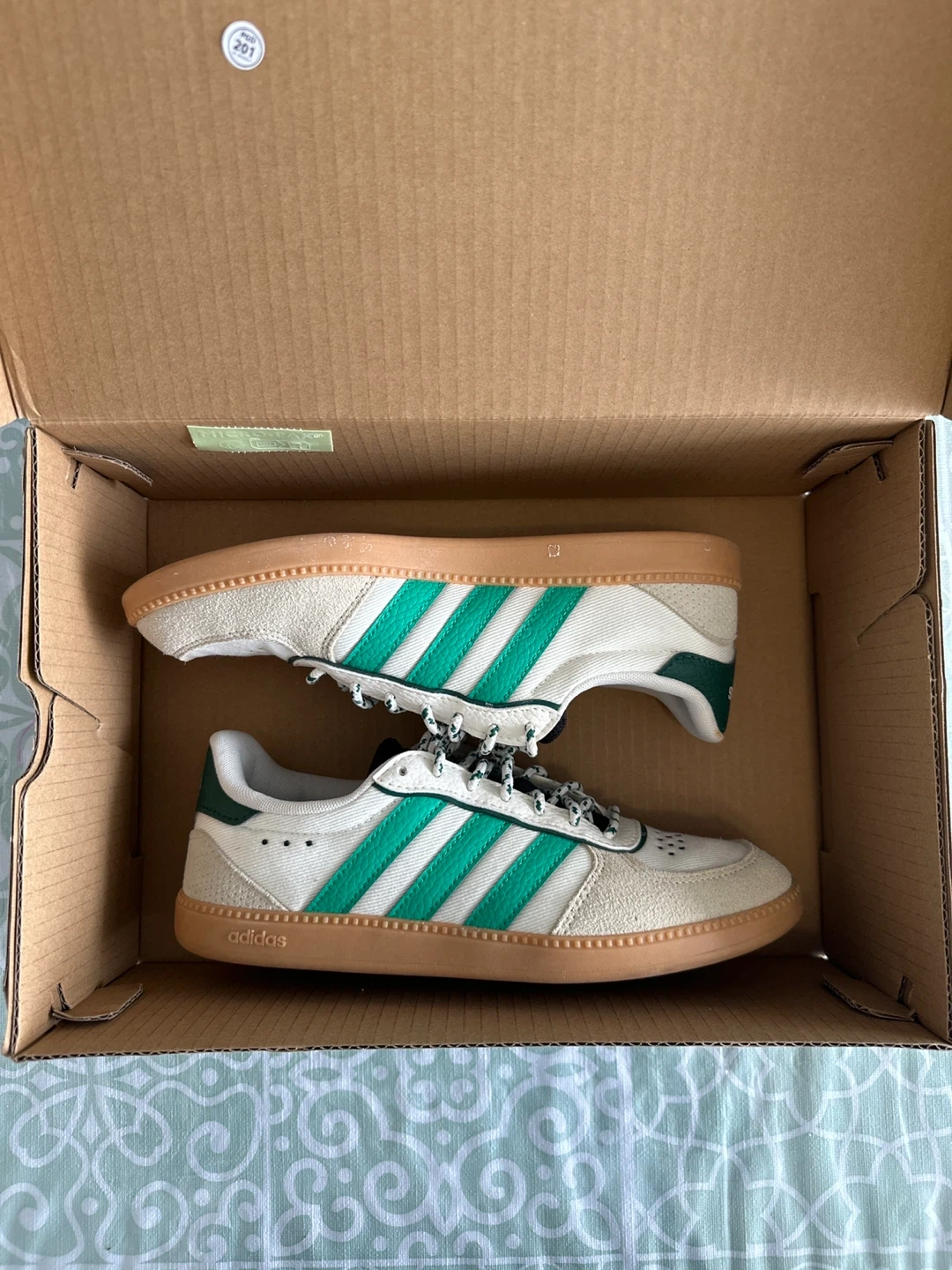 These New Adidas Breaknet Sleek unused shoes are designed for tennis. They feature white, green, and beige accents with a gum sole. The shoes come in their original box.