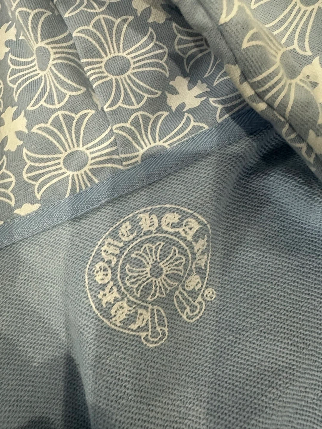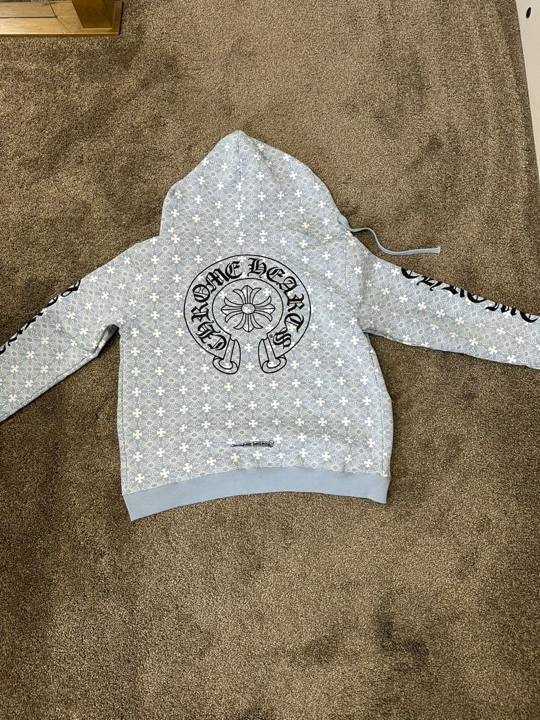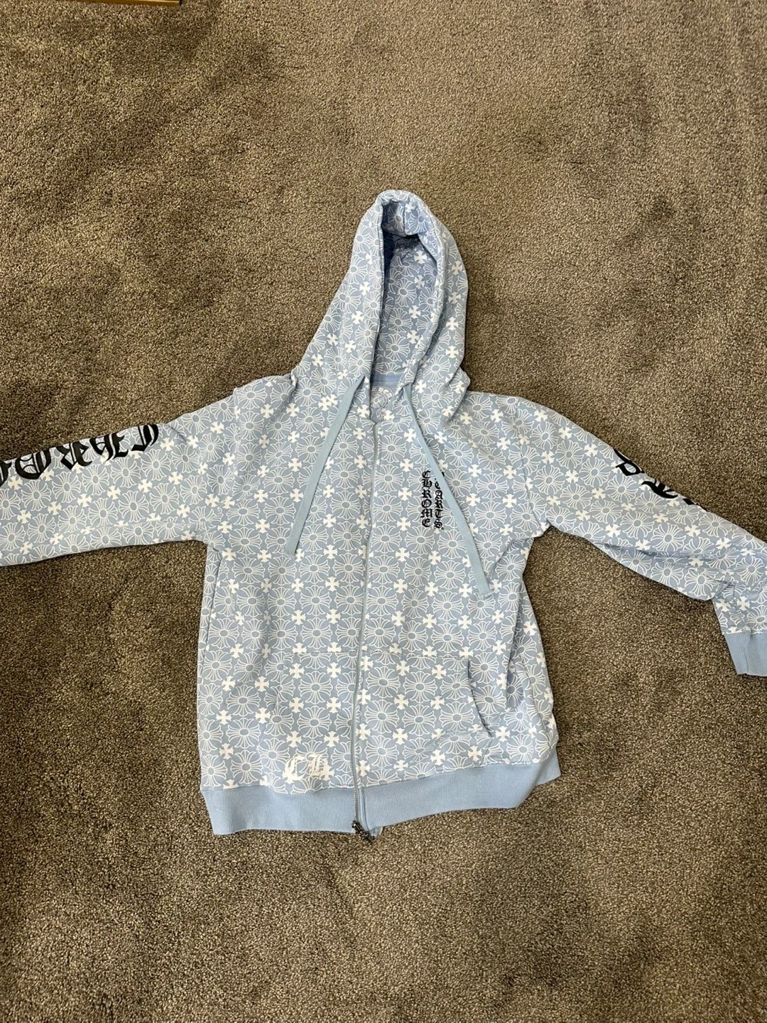 This Chrome Hearts zip-up hoodie features a light blue colour with a repeating white floral pattern. It has the iconic Chrome Hearts logo on the chest and sleeve. Made from comfortable material.