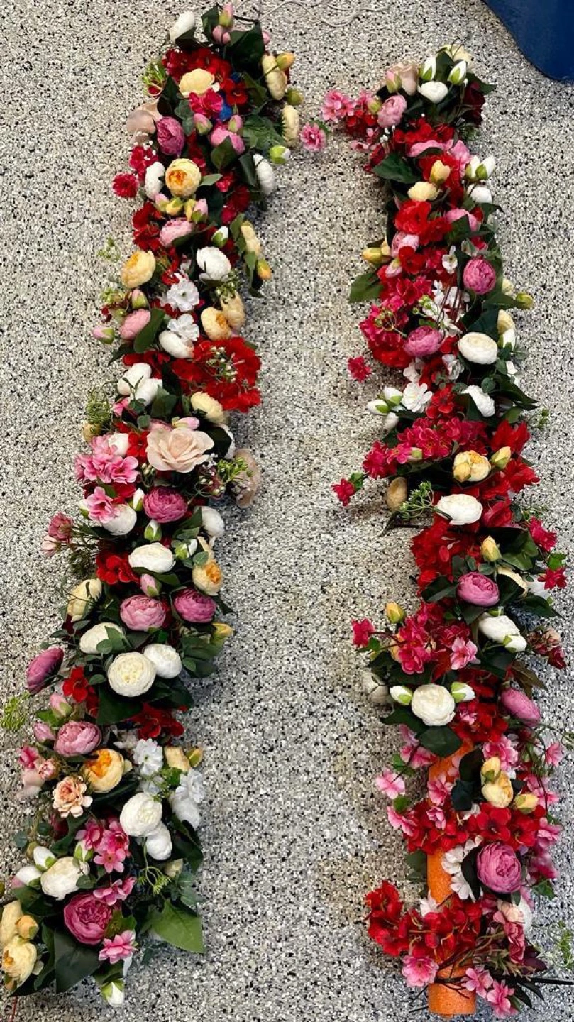 Two long garlands of artificial flowers. White, pink, red and yellow flowers with green leaves. Can be used for weddings, parties or home decor or any other occasion.