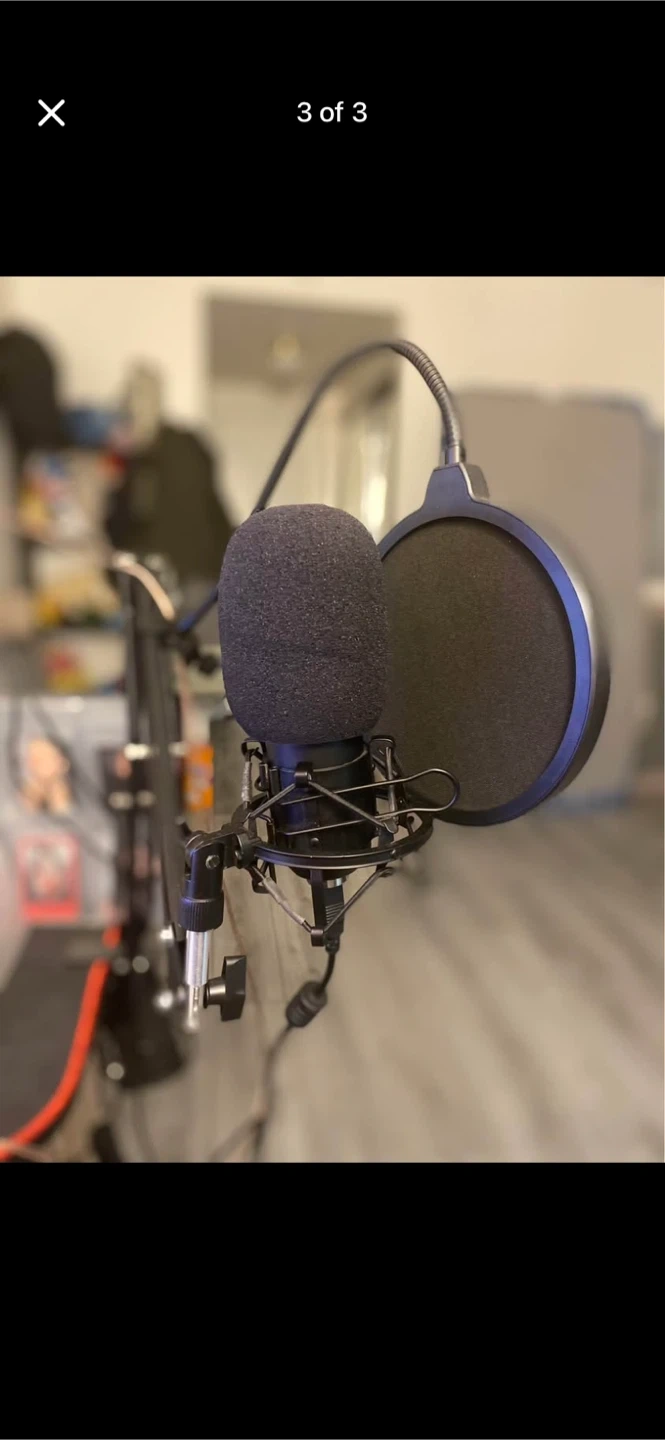 This is a Maono condenser microphone kit. It comes with a boom arm, shock mount, pop filter, and windscreen. The microphone connects via USB.