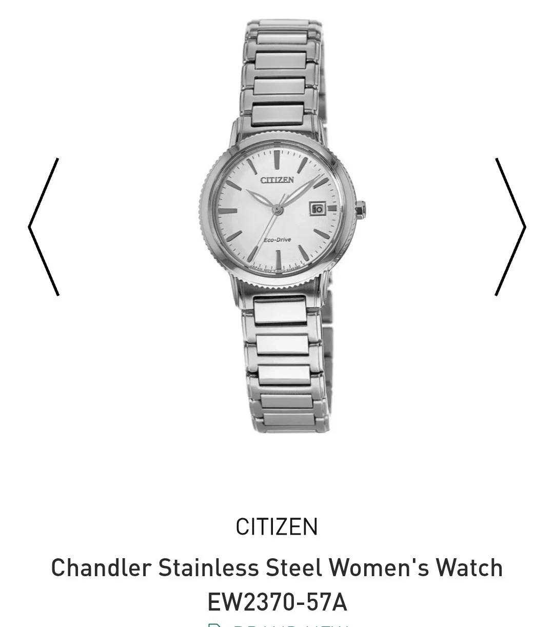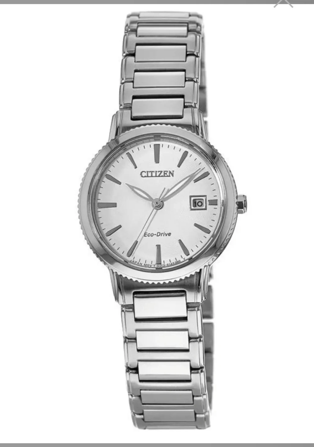 Citizen Chandler stainless steel women's watch with Eco-Drive technology. Features a clean white dial and a date display. It's a reliable and stylish timepiece.