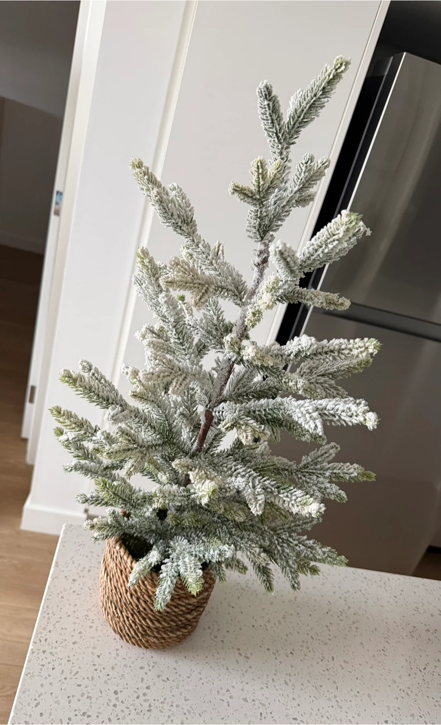 Decorative 2 ft tall faux pine plant with a snowy/frosted look, perfect for winter or Christmas decor. Comes in a beautiful woven-style planter that adds a cozy, natural touch.