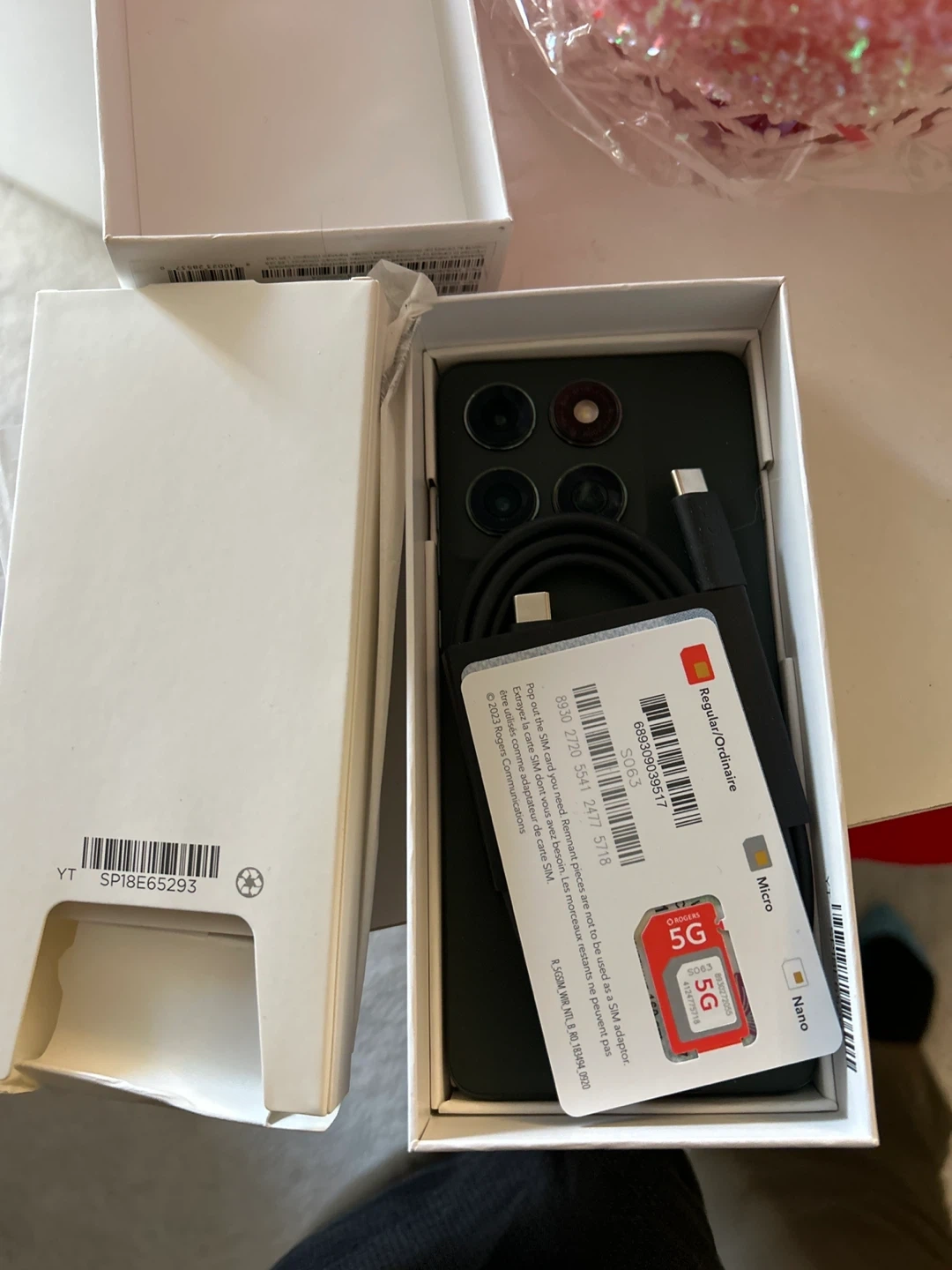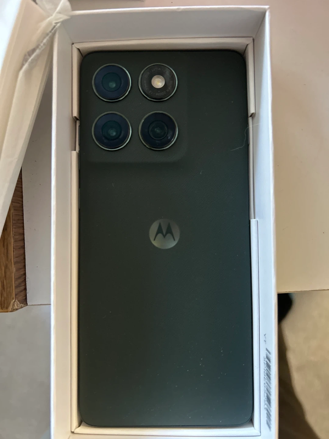 Motorola Edge 2025 smartphone in dark green. It's in the original box with a USB-C charging cable included. This phone comes unlocked and ready to use!