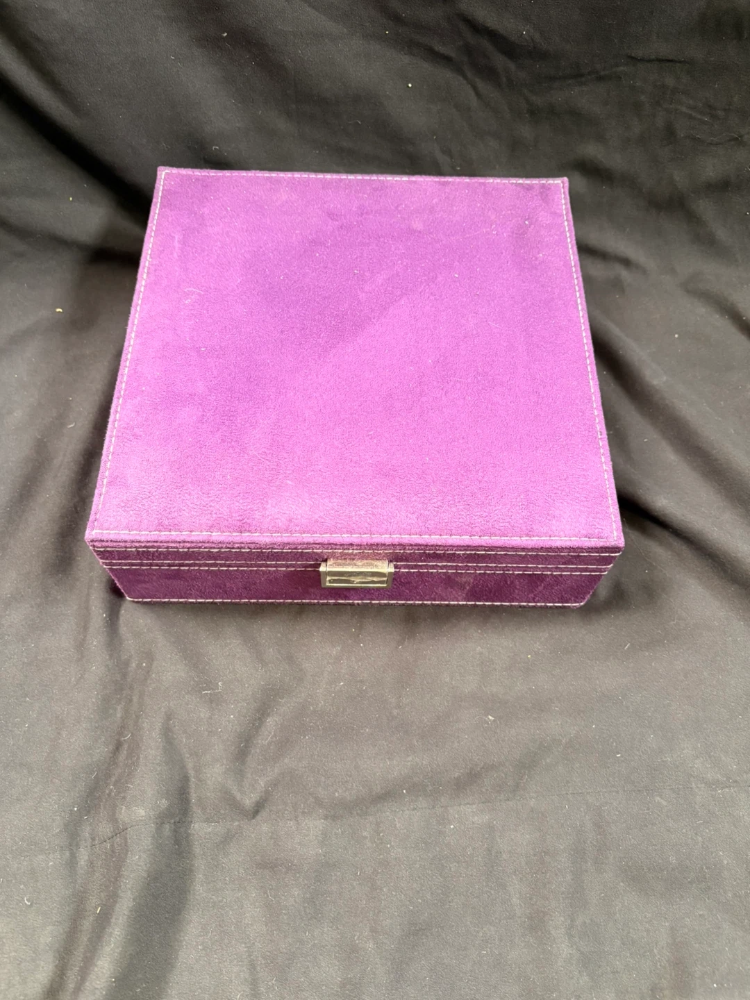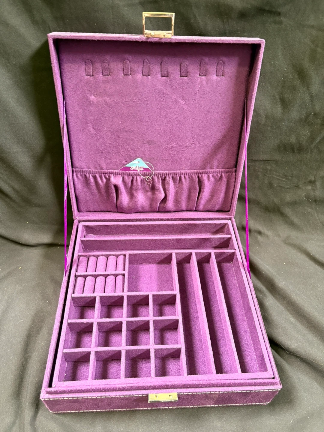 Purple suede jewellery box with multiple compartments. Features a removable tray for extra storage and organization. It's a great way to keep your trinkets tidy!