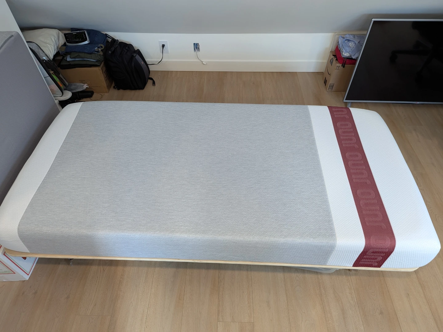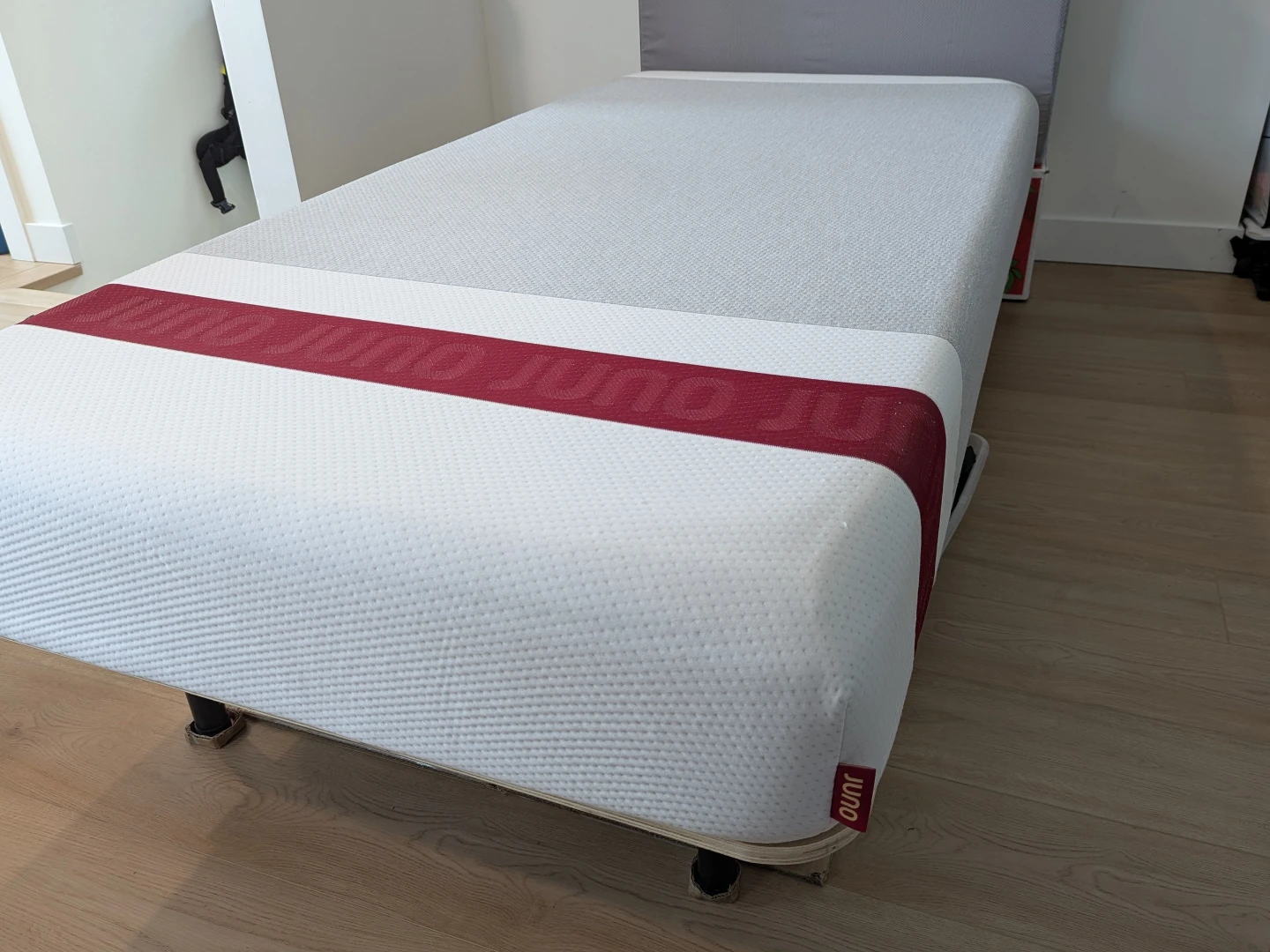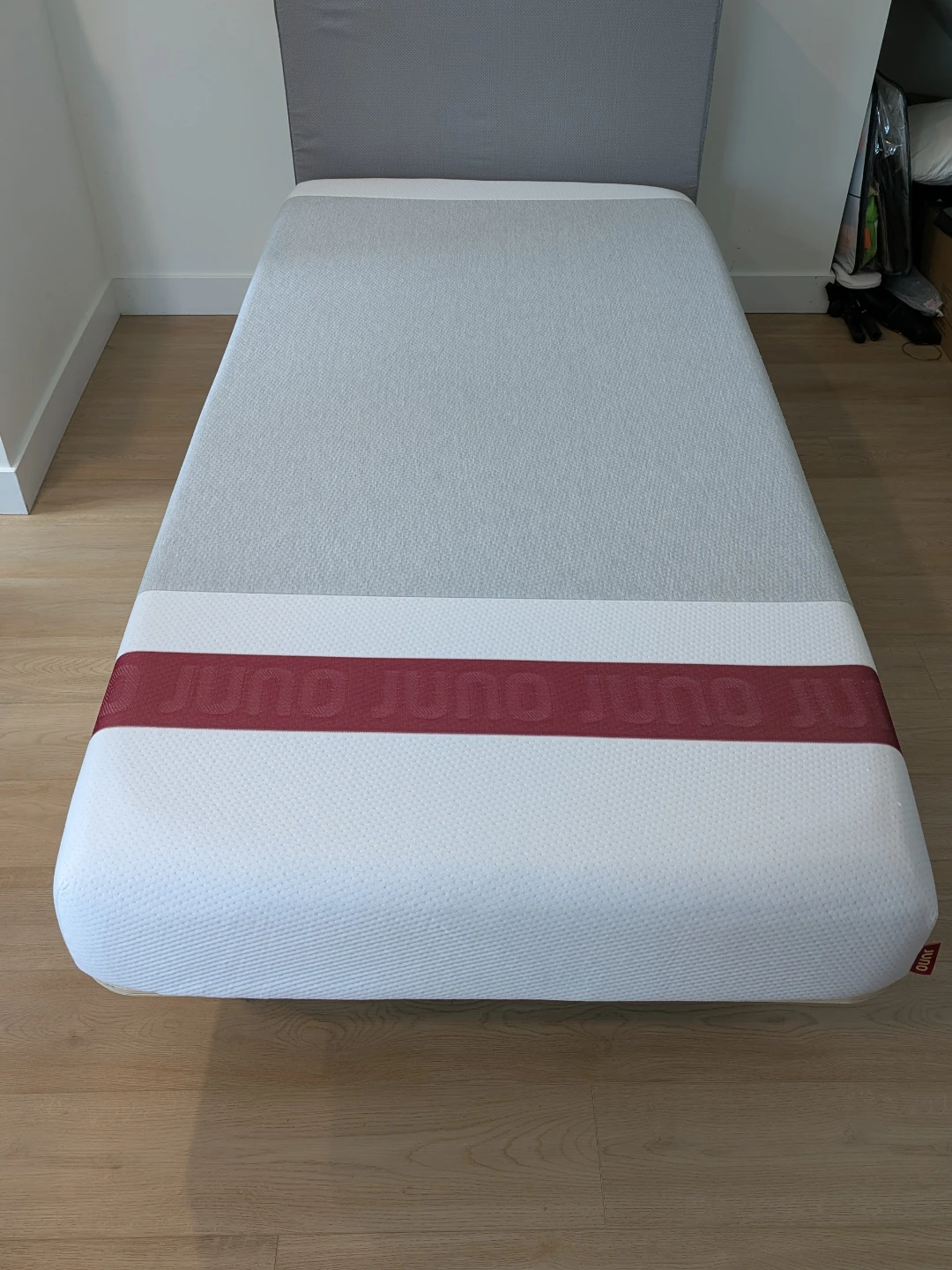 Included is the bed frame and the Juno Twin XL mattress that has 8" of memory foam, medium-firm feel. It features a comfortable design with a grey and white colour scheme and a burgundy band. It's a great option for a good night's sleep!