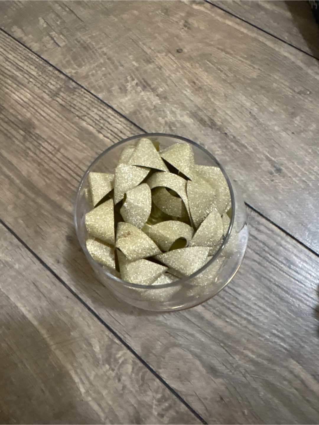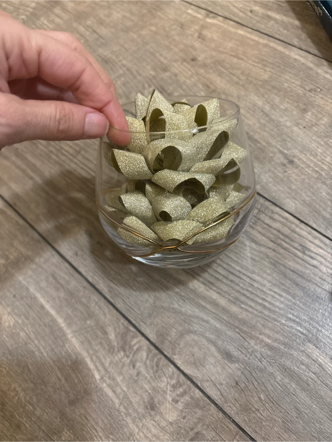 A collection of shimmery gold glitter bows fill a clear glass vase. These festive bows are perfect for adding a touch of sparkle to your holiday decor or gift wrapping. They'd be great for parties or special occasions!