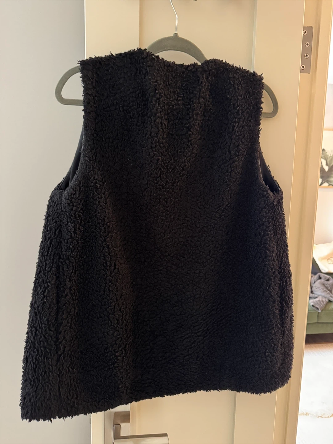 Cozy black sherpa vest from Wilfred. It's made of soft, fluffy material with a zip-up front.