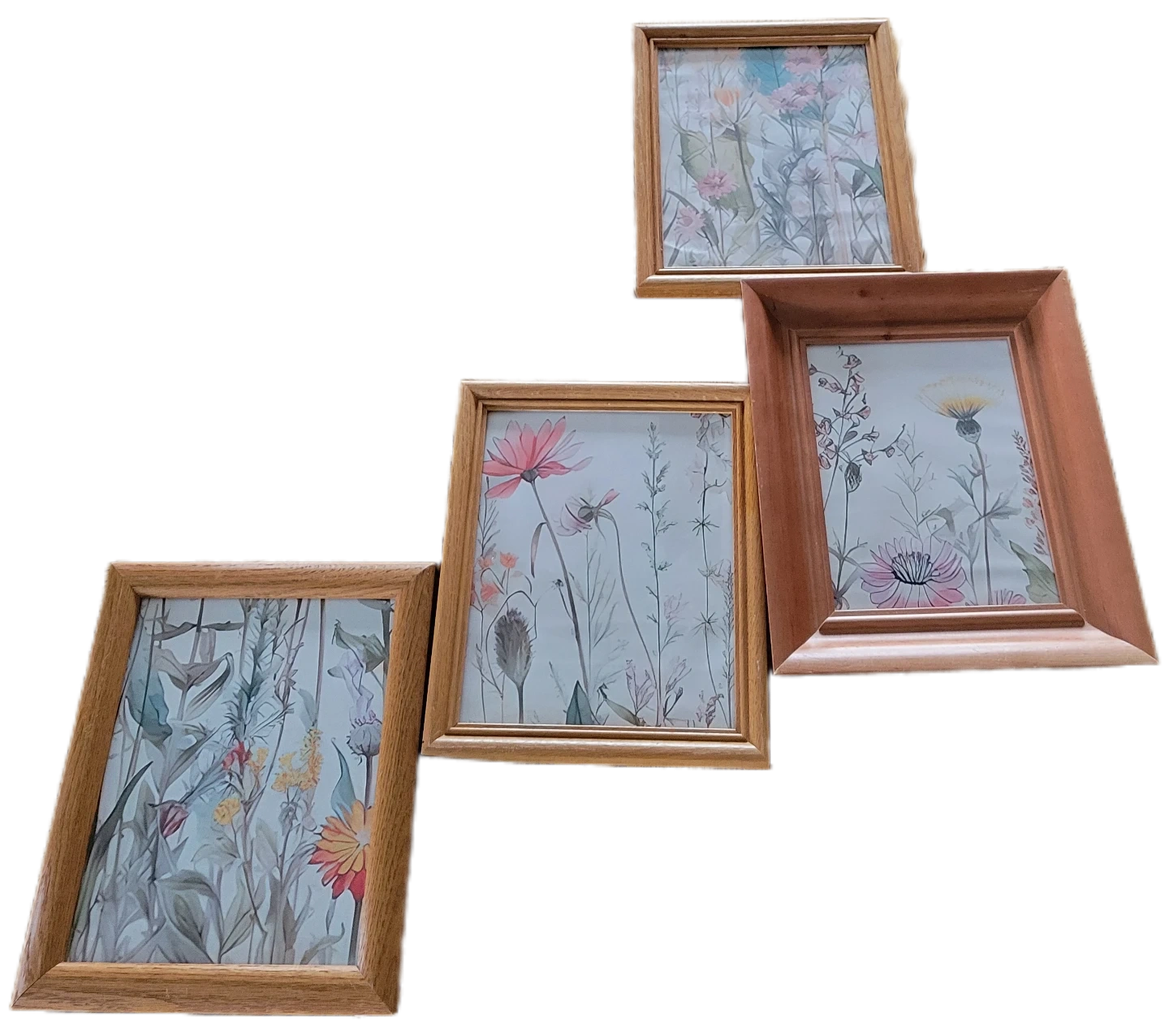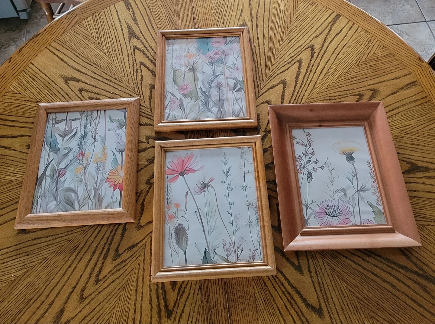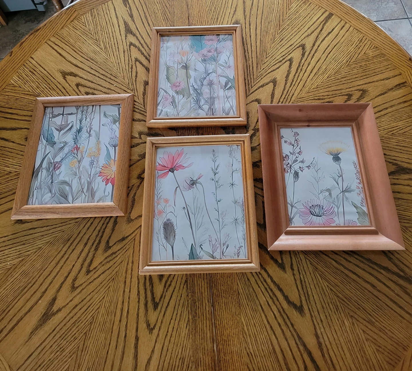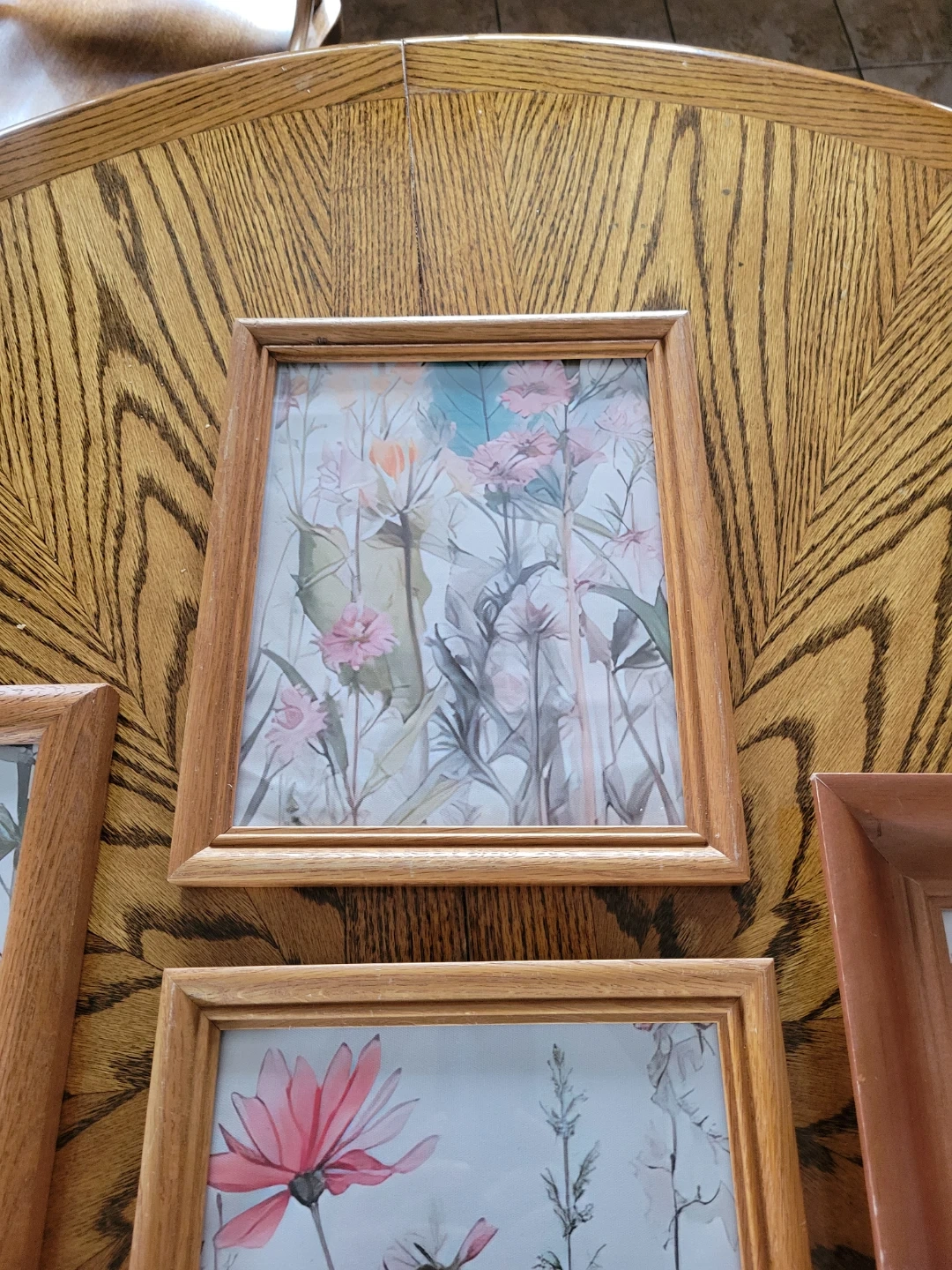 Vintage oak picture frames, each showcasing delicate floral art. These frames add a touch of timeless elegance to any room, perfect for displaying cherished memories or enhancing your art collection. While these frames are used, they maintain a good quality.