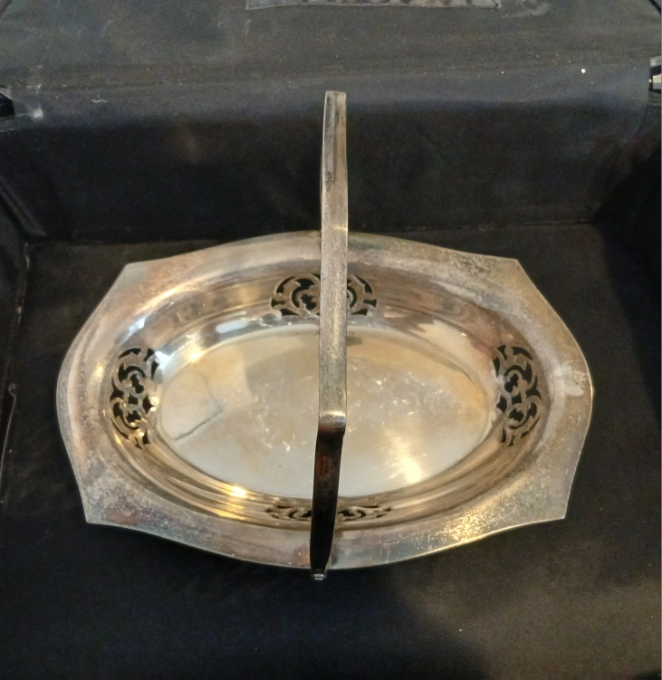 This is a silver-plated serving basket with a handle. It features ornate cut-out details along the sides. Perfect for serving bread or pastries!