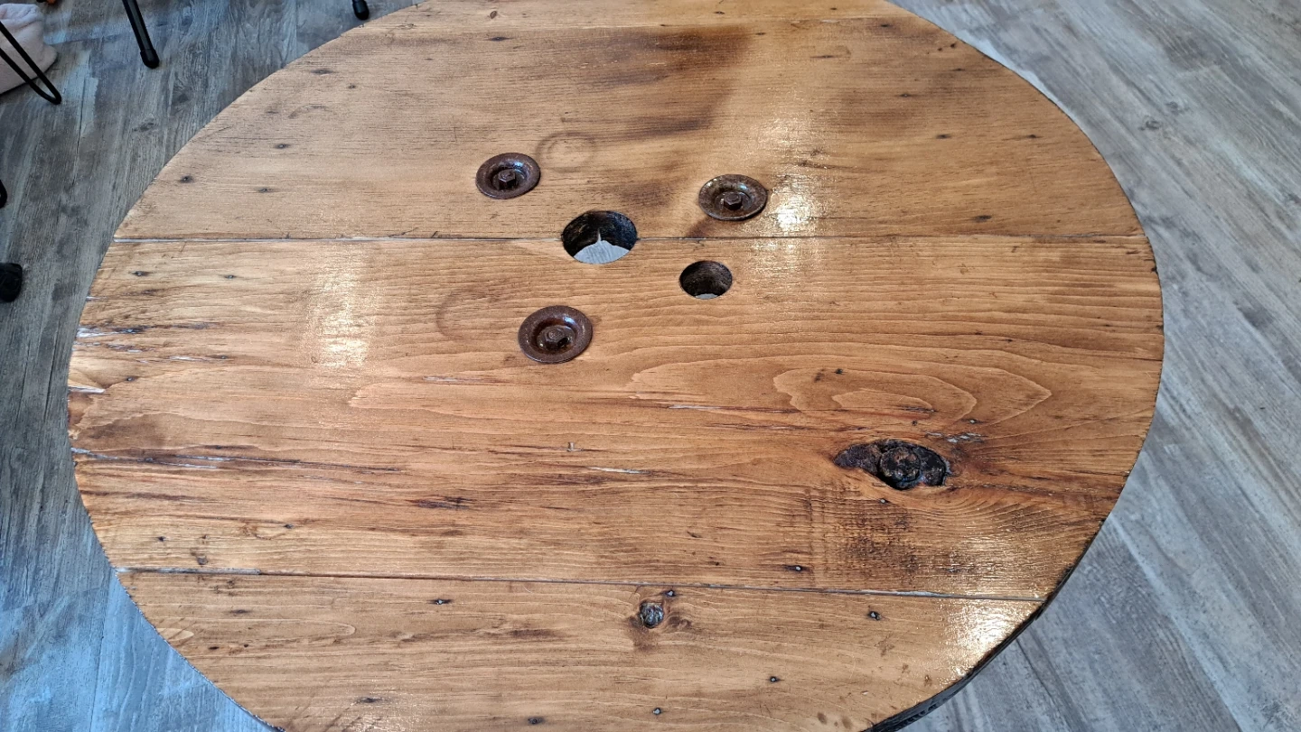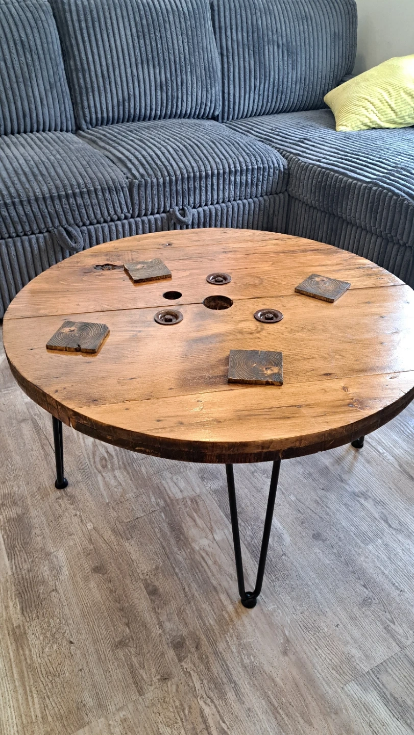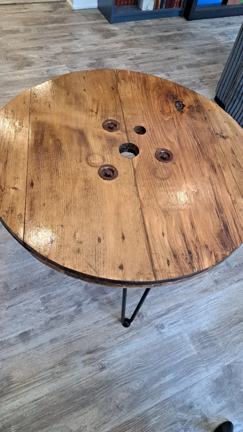 Unique coffee table made from a reclaimed wooden spool. It's finished with a clear coat and features sturdy black hairpin legs. The rustic charm of the wood grain is really something special!