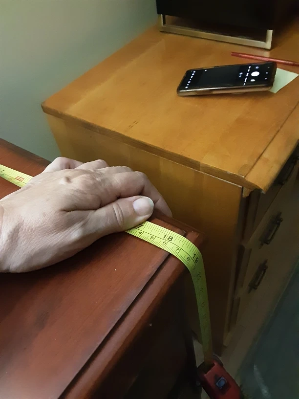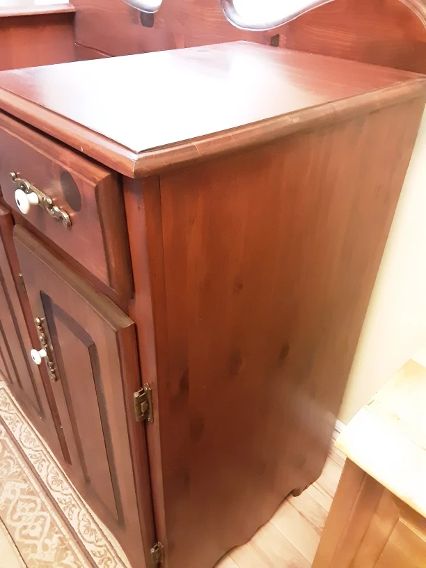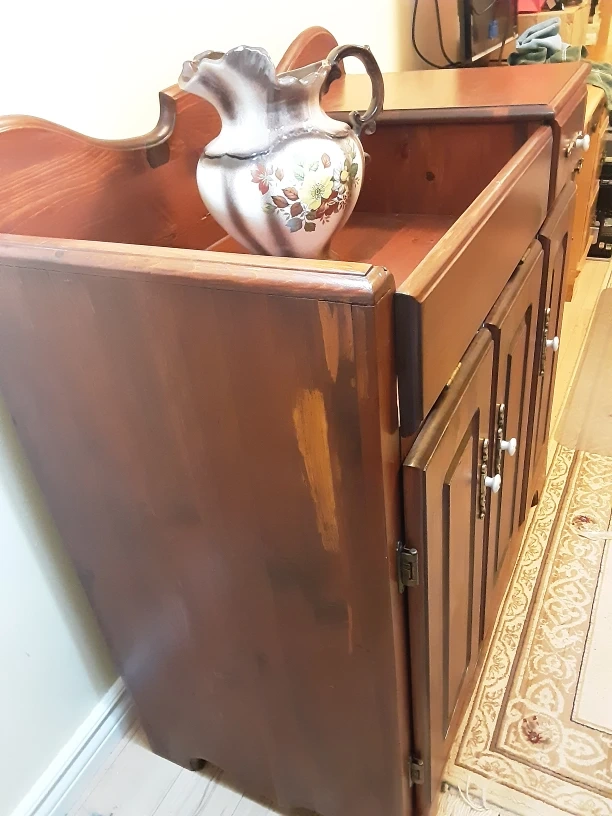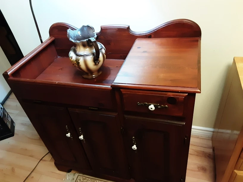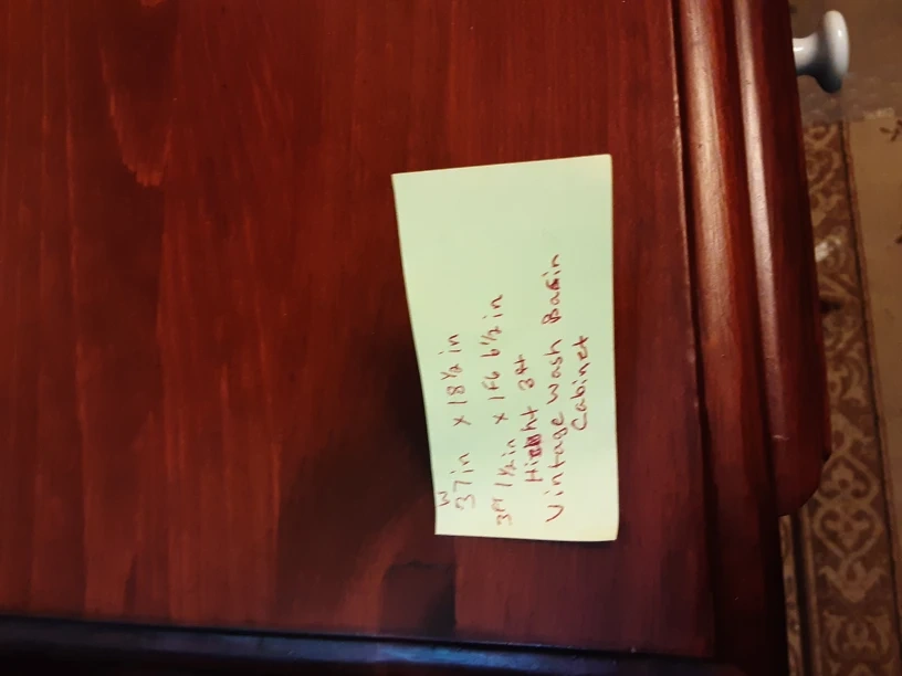This vintage wash basin cabinet measures 37 inches wide, 18.5 inches deep, and 6.5 inches high. It's a beautiful wooden piece with storage below. Perfect for adding a classic touch to your space! I don't have the space for this beautiful piece anymore 😢