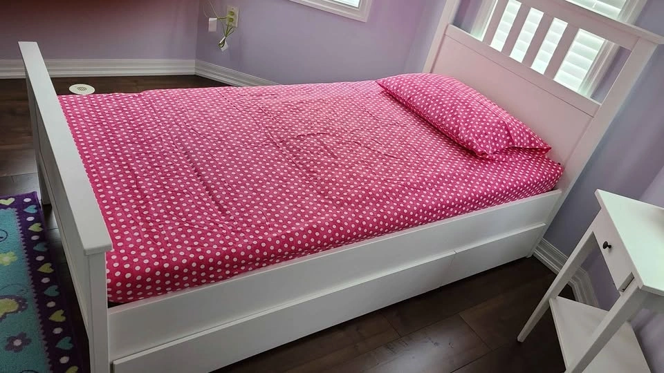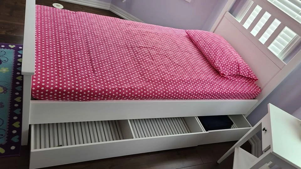 Spacious white single bed frame with two pull-out storage drawers underneath, super handy for toys or clothes. Great for a kid's room. Mattress can be included.