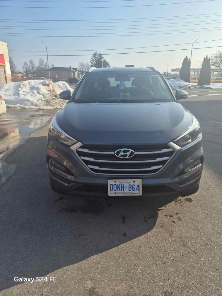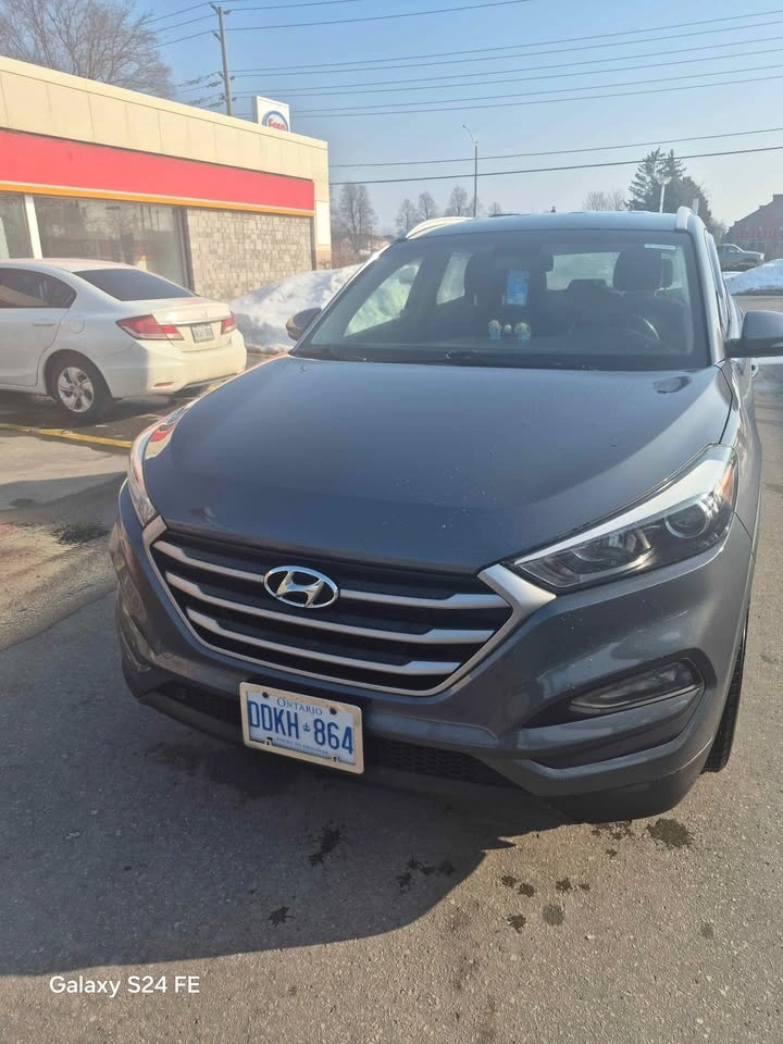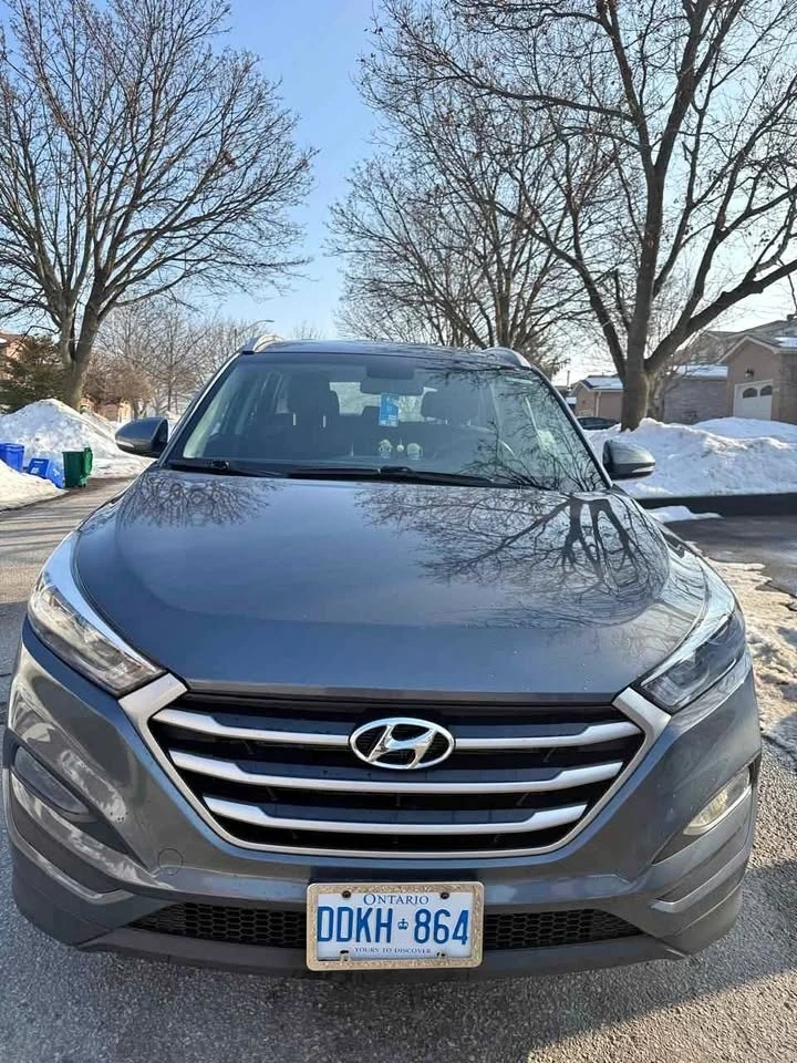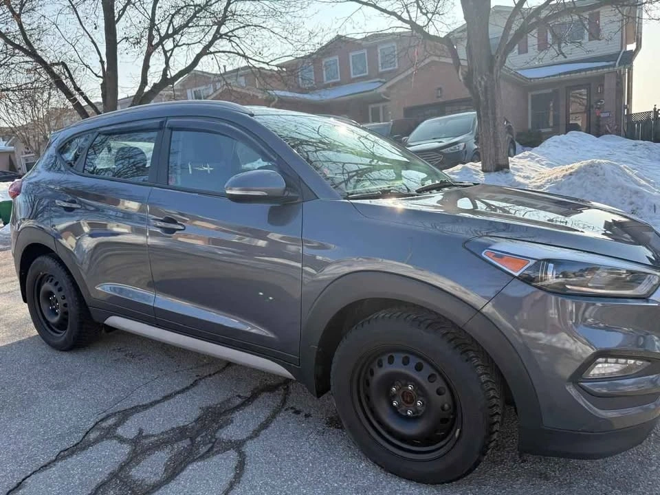 Spacious dark gray Hyundai Tucson SUV. Comes with winter tires on steel rims, ready for colder weather. Also includes roof rails and a car cover.